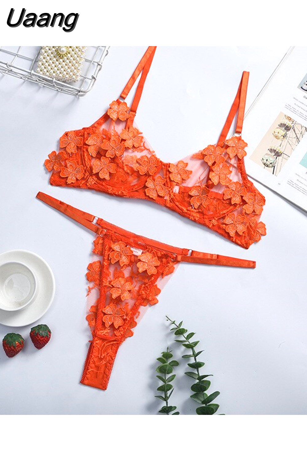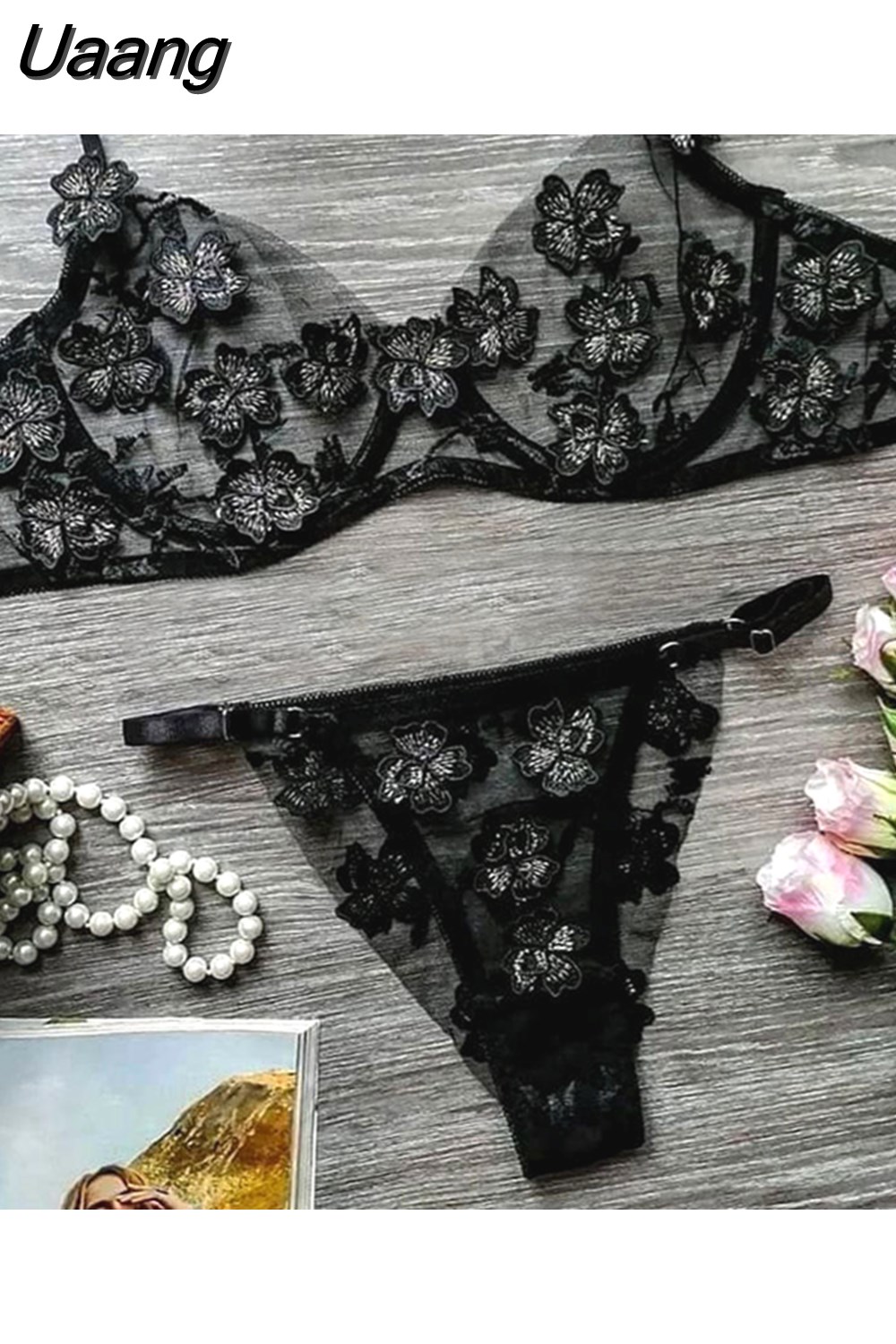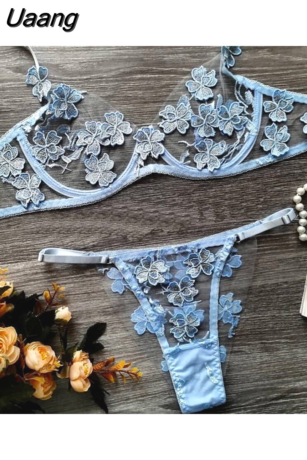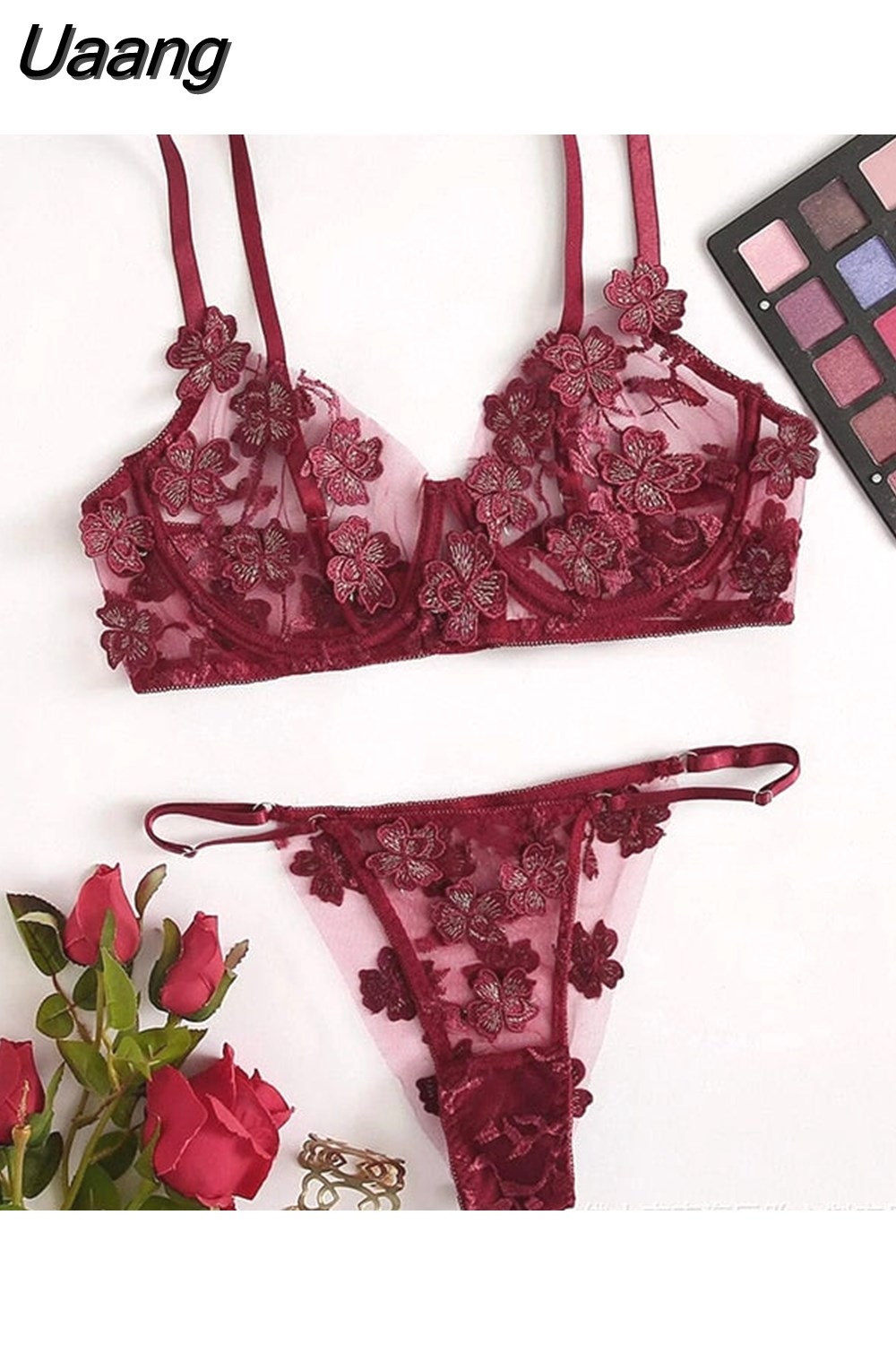 Uaang Sensual Lingerie Set Women 3D Flower Embroidery Underwear Set Ladies Sexy Lace Intimate Push Up Underwire Bra Sets 405-1