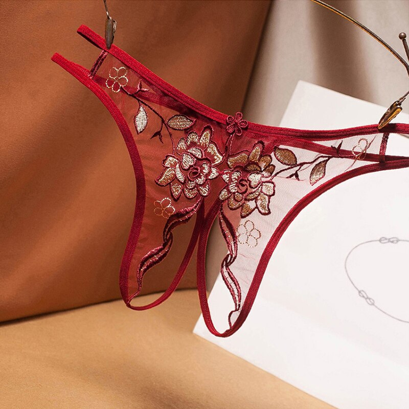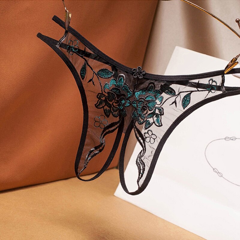 Uaang Women's briefs sexy  French embroidery sexy mesh hollow out free off thong low waist transparent t pants G-String