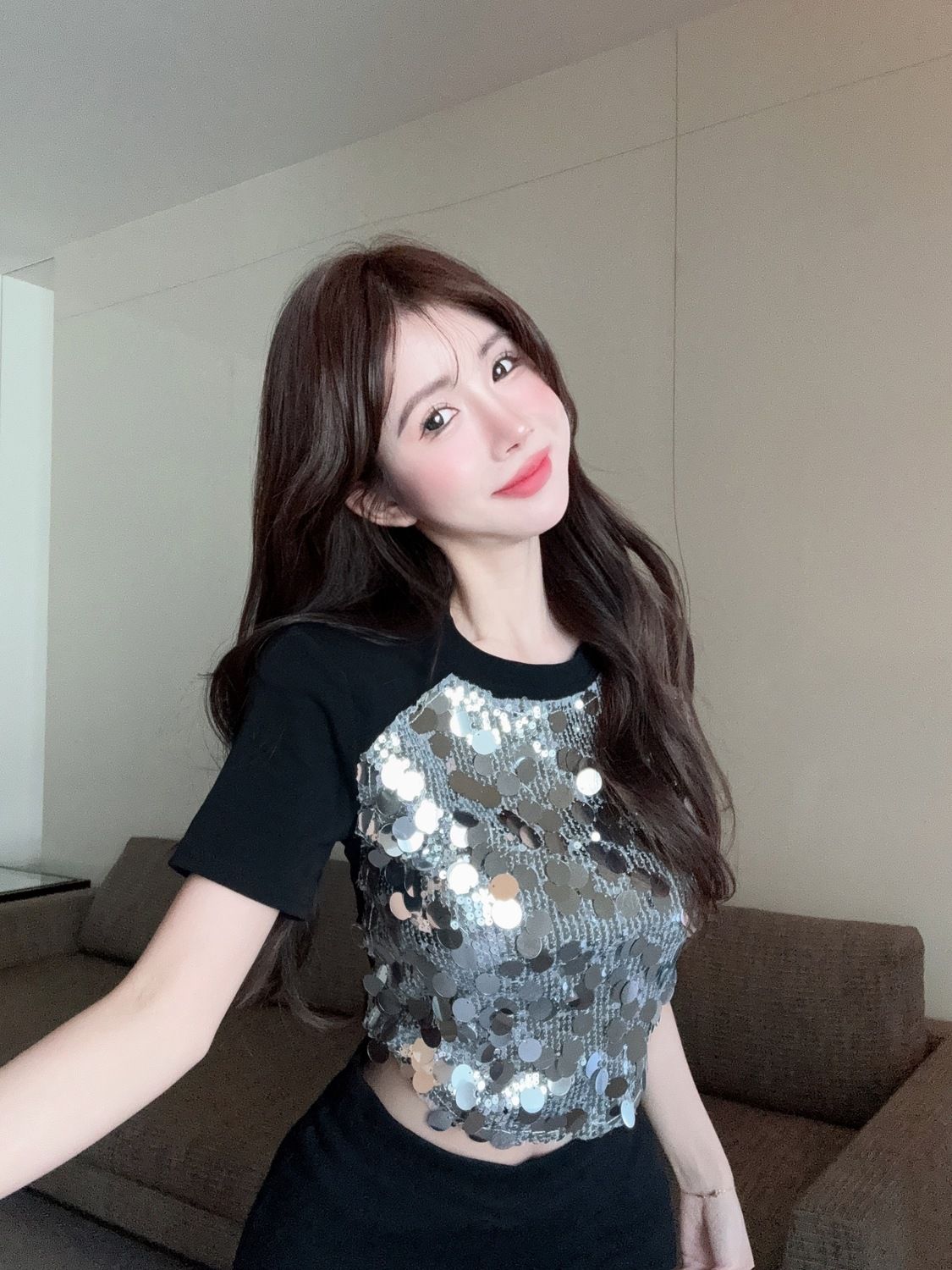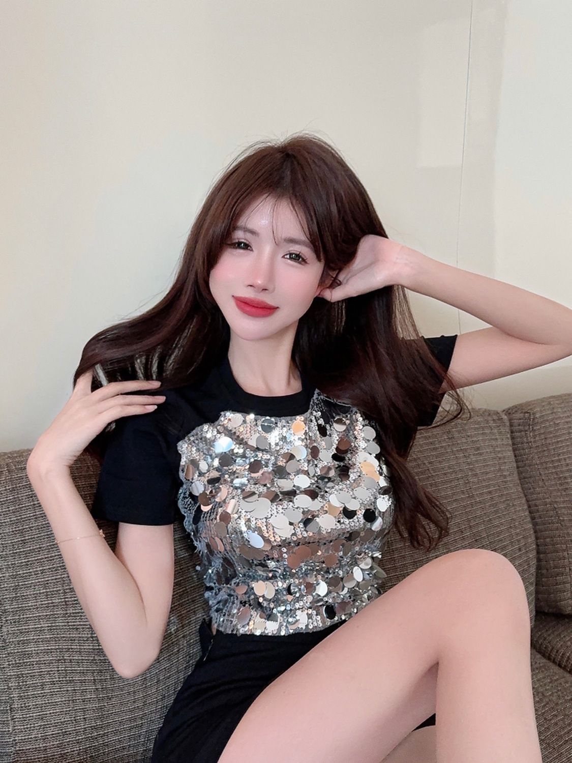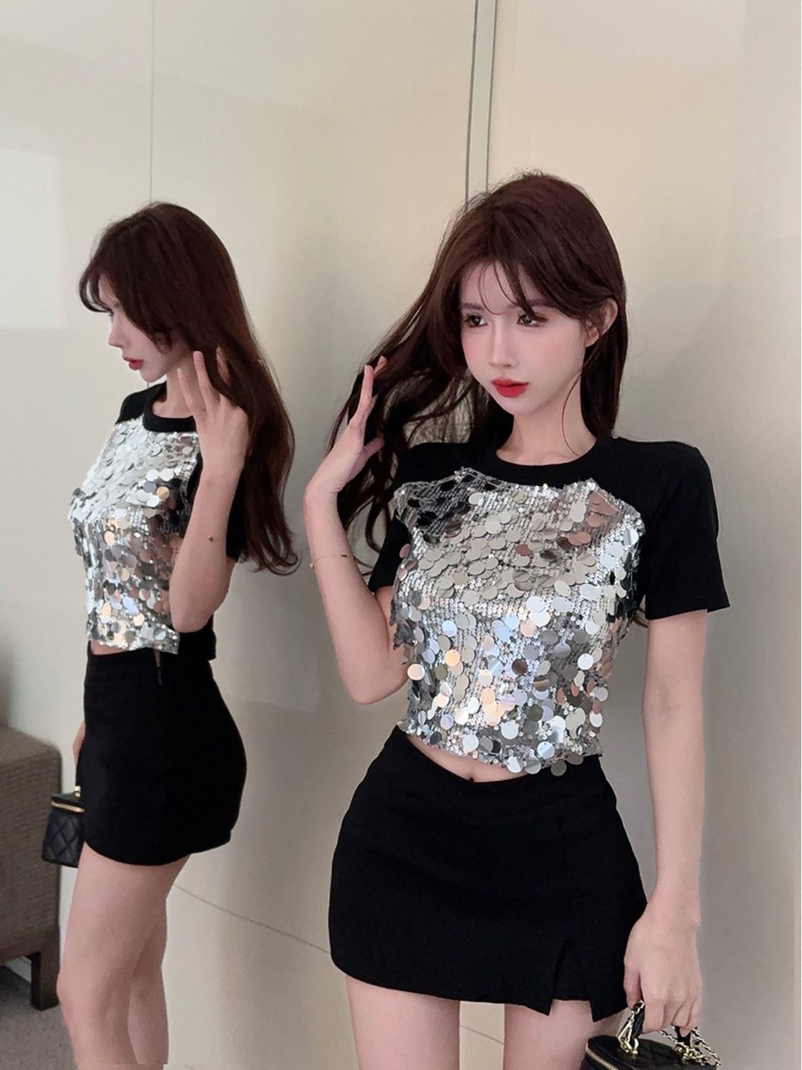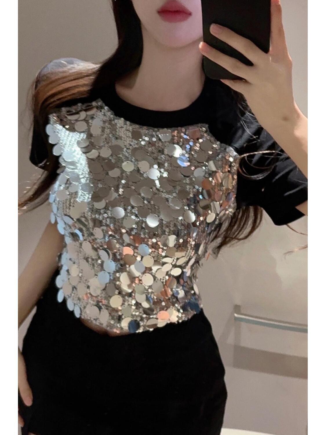 Uaang New Sexy Sequined Patchwork Crop Top Women's T Shirts Fashion Short Sleeve Round Neck Sequin T-shirt Tees