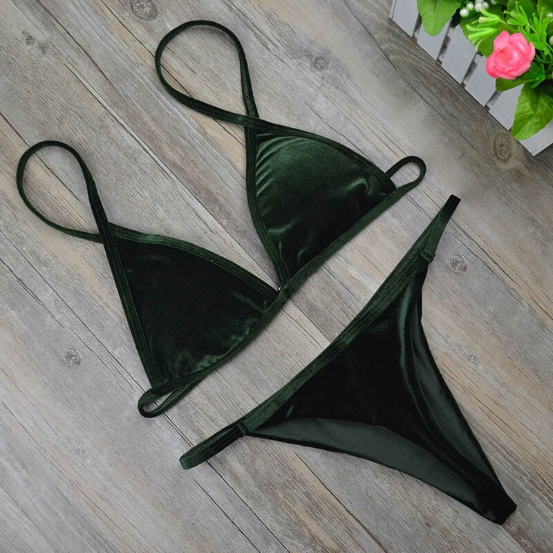 2019 Women Dark Green Orange Gold Velvet Thong Bikinis Sets Swimwear Swimsuit Brazilian Beach Wear Bathing Suit 2221