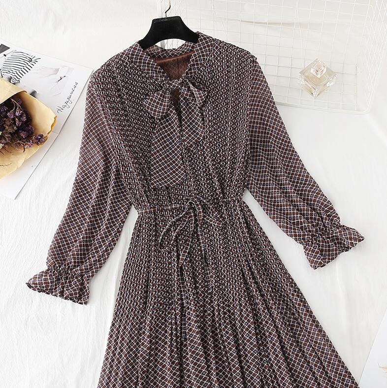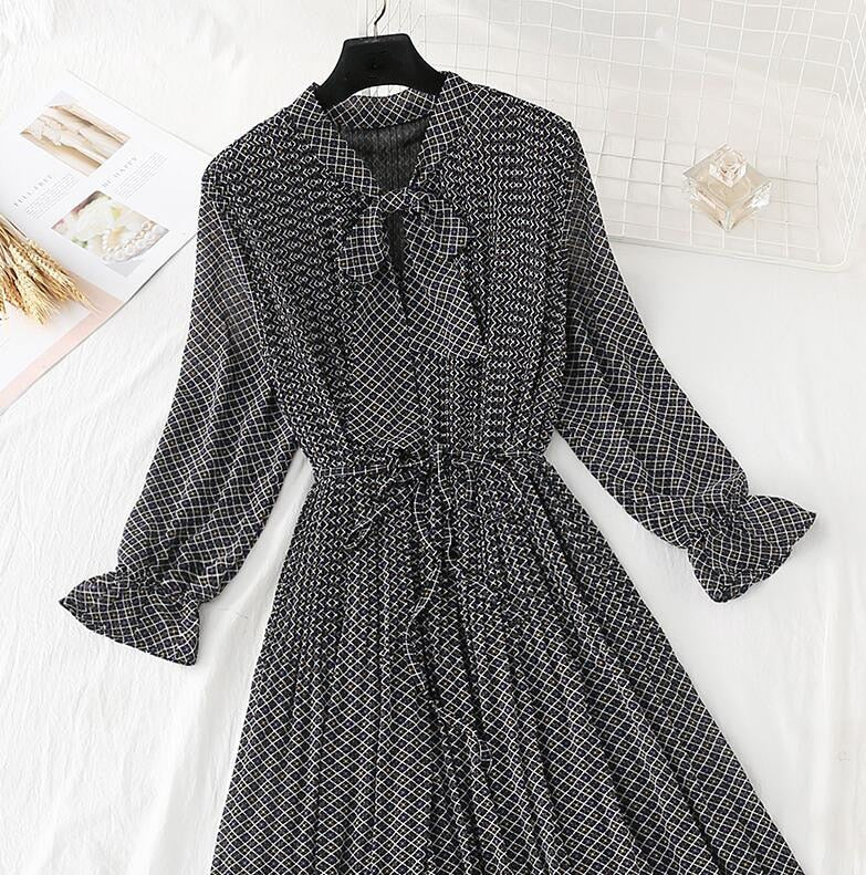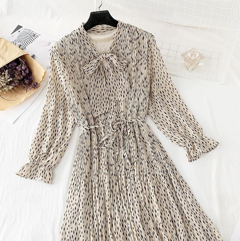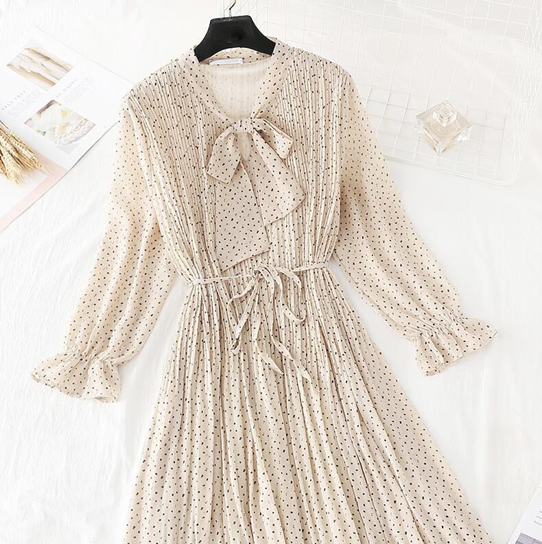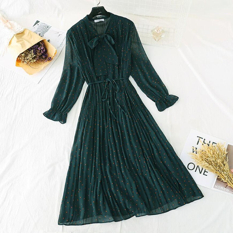 2020 Elegant Women Dress Vintage Bow Polka Dot Print Loose Midi Dress Female Casual Ruffles Pleated Chiffon Dresses Vestidos