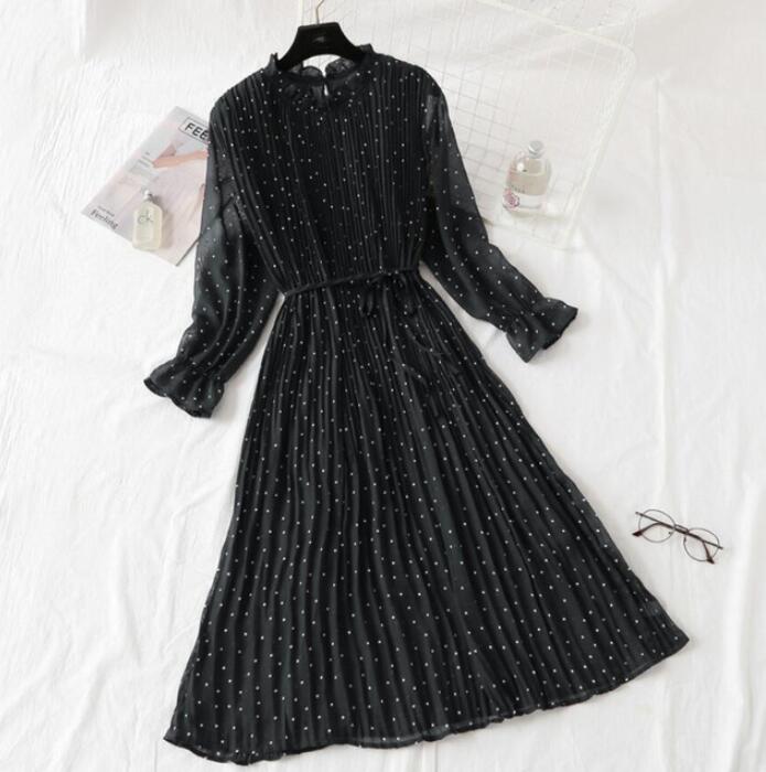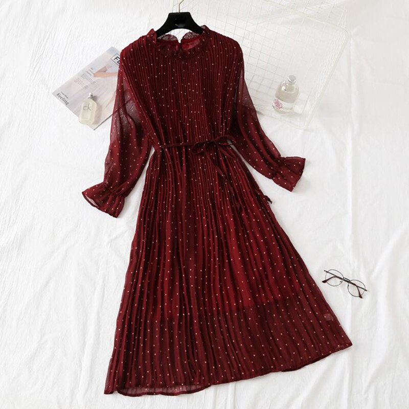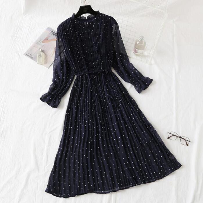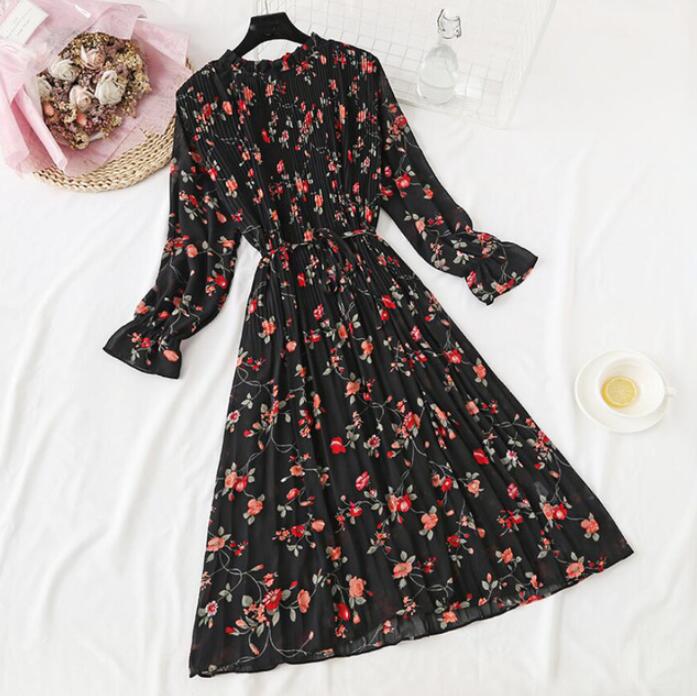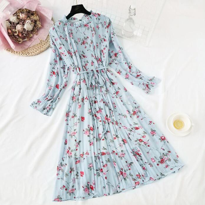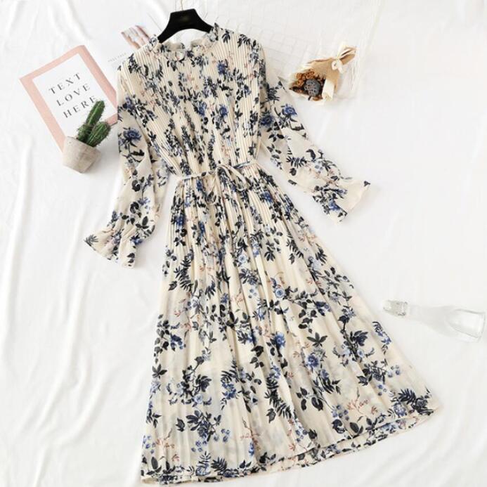2020 Elegant Women Print Chiffon Dress Long sleeve Lotus leaf collar Pleated Dress Female Casual Midi Dresses vestidos mujer
