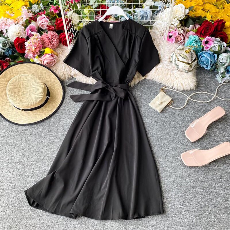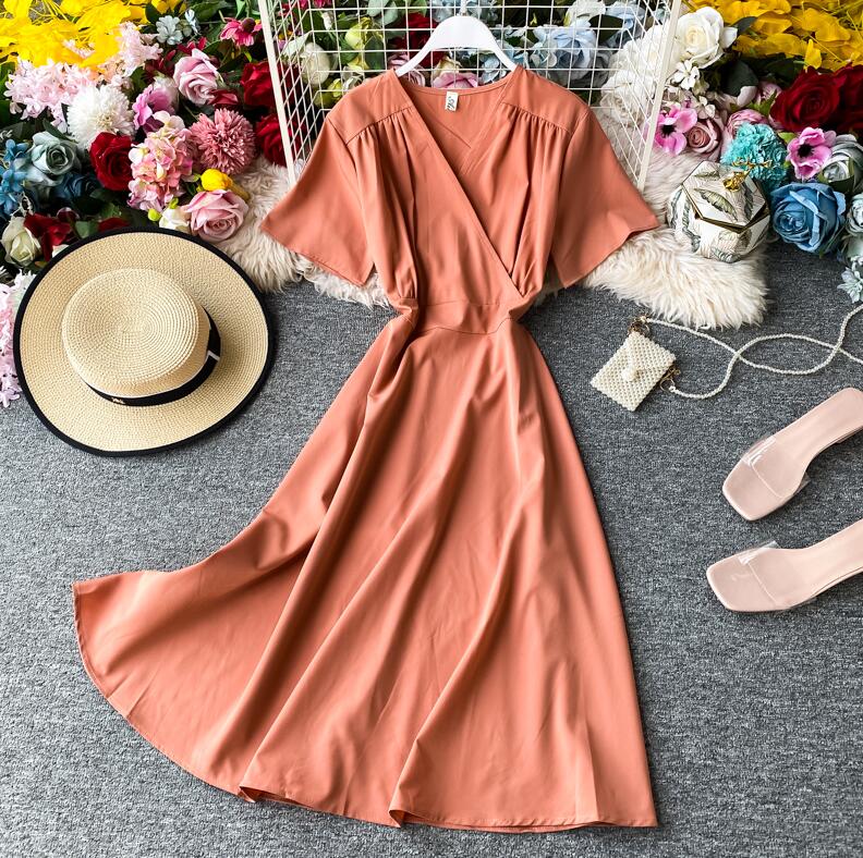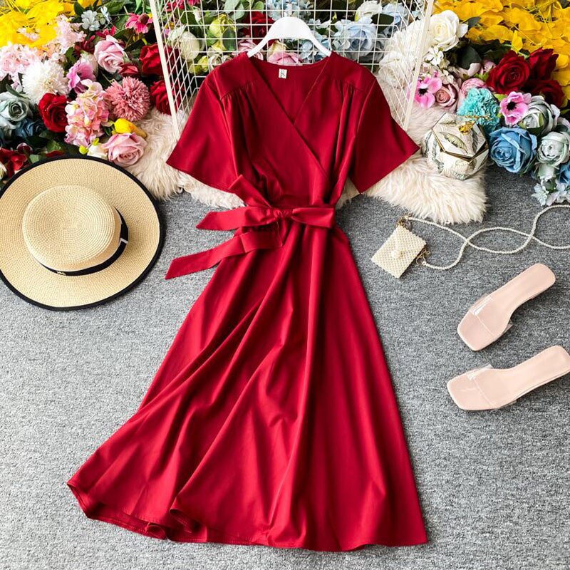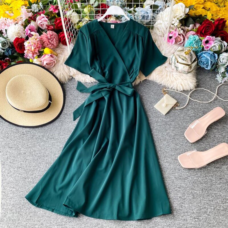 2020 Solid color Summer Women Dress Short sleeve Sexy V-neck Ruffles Chiffon Dress Vintage Elegant Lady A Line Bandage Dresses