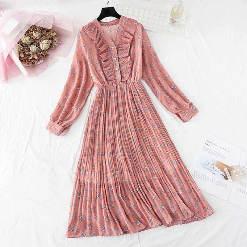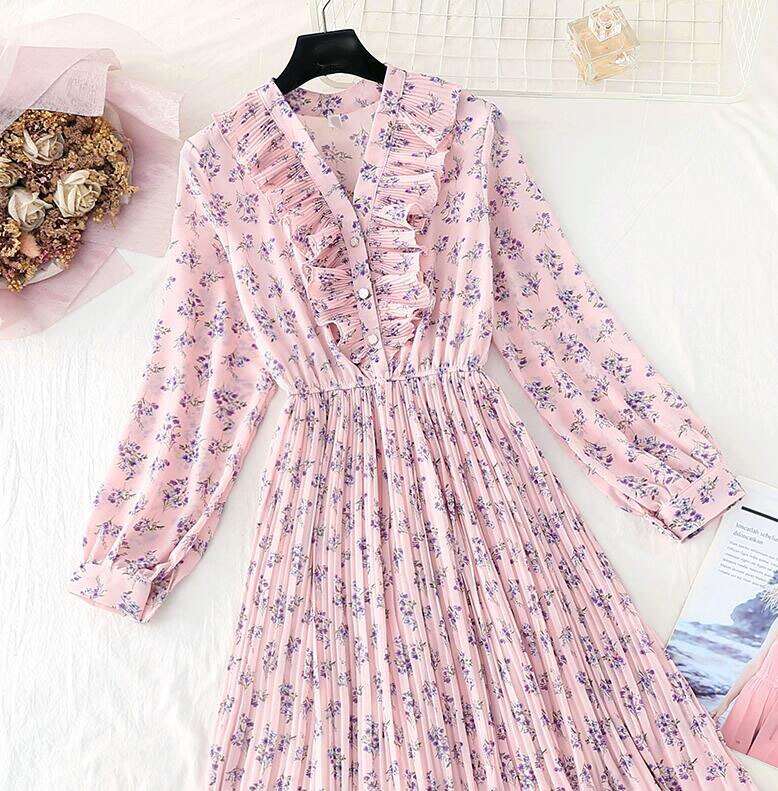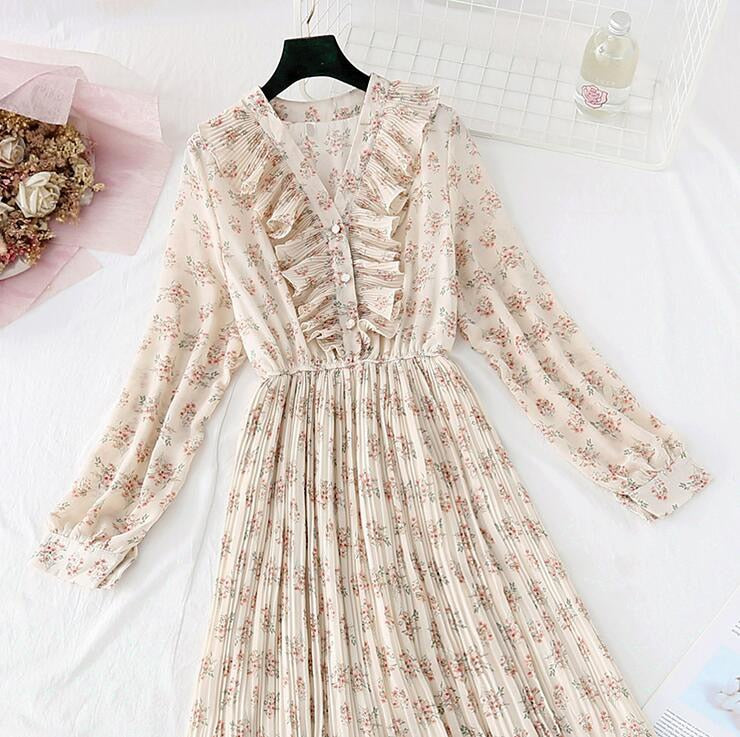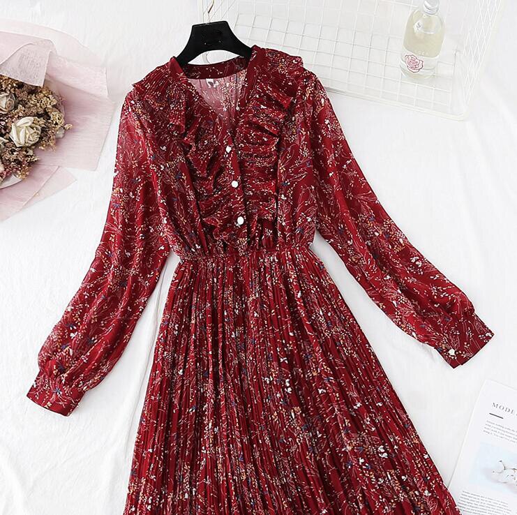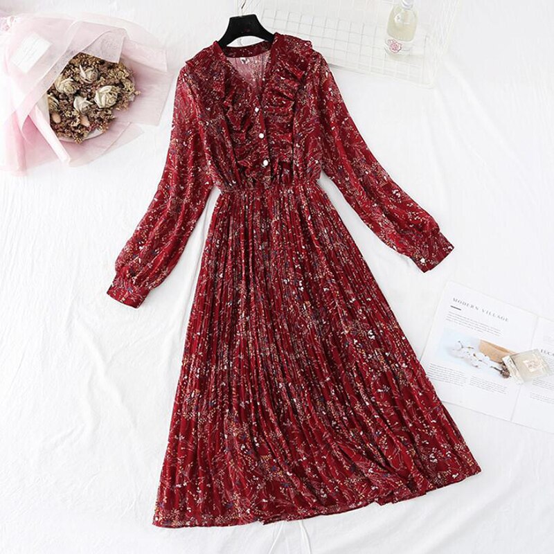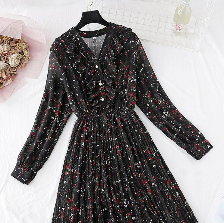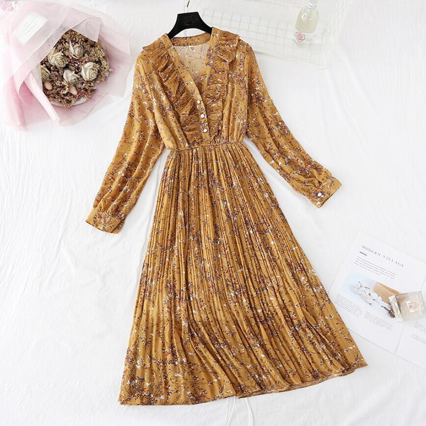 2020 Spring Summer Pleated Chiffon Dresses Women Vintage V-neck Ruffles Long Dress Long Sleeve Floral print Office Dress Vestido