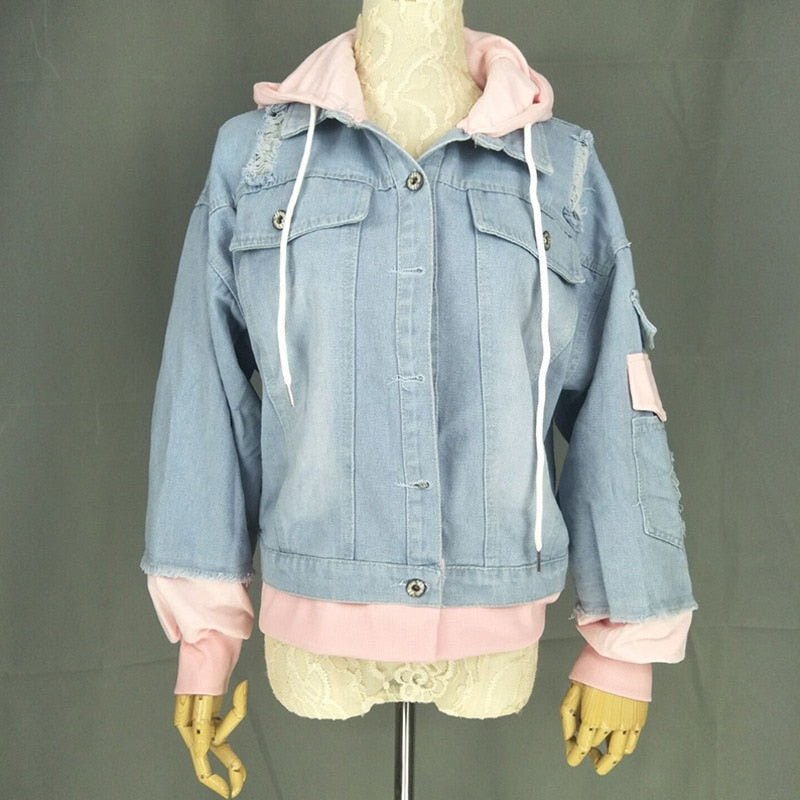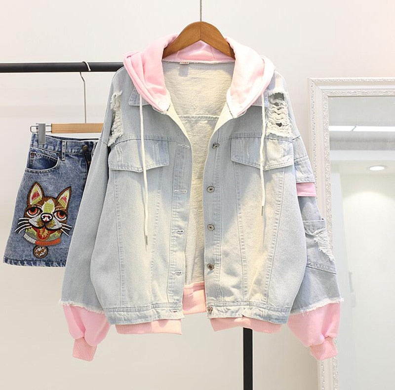2021 Autumn Hooded Denim Jacket For Women Casual BF Jeans Jacket Holes Vintage Harajuku Coat Female Loose Streetwear Basic Coats