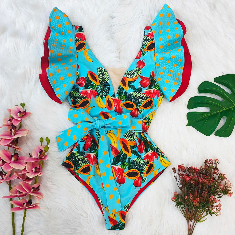 2021 New Sexy Deep-V One Piece Swimsuit Female Women Vintage Retro Bathing Suit Ruffle Swimwear Backless Beach Wear Monokini