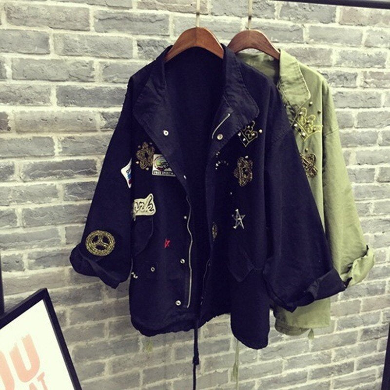 2021 Women Cotton Jacket Coat Casual Women Bomber jacket Embroidery Applique Rivets Oversize Women Coat Army Green Cotton Coat