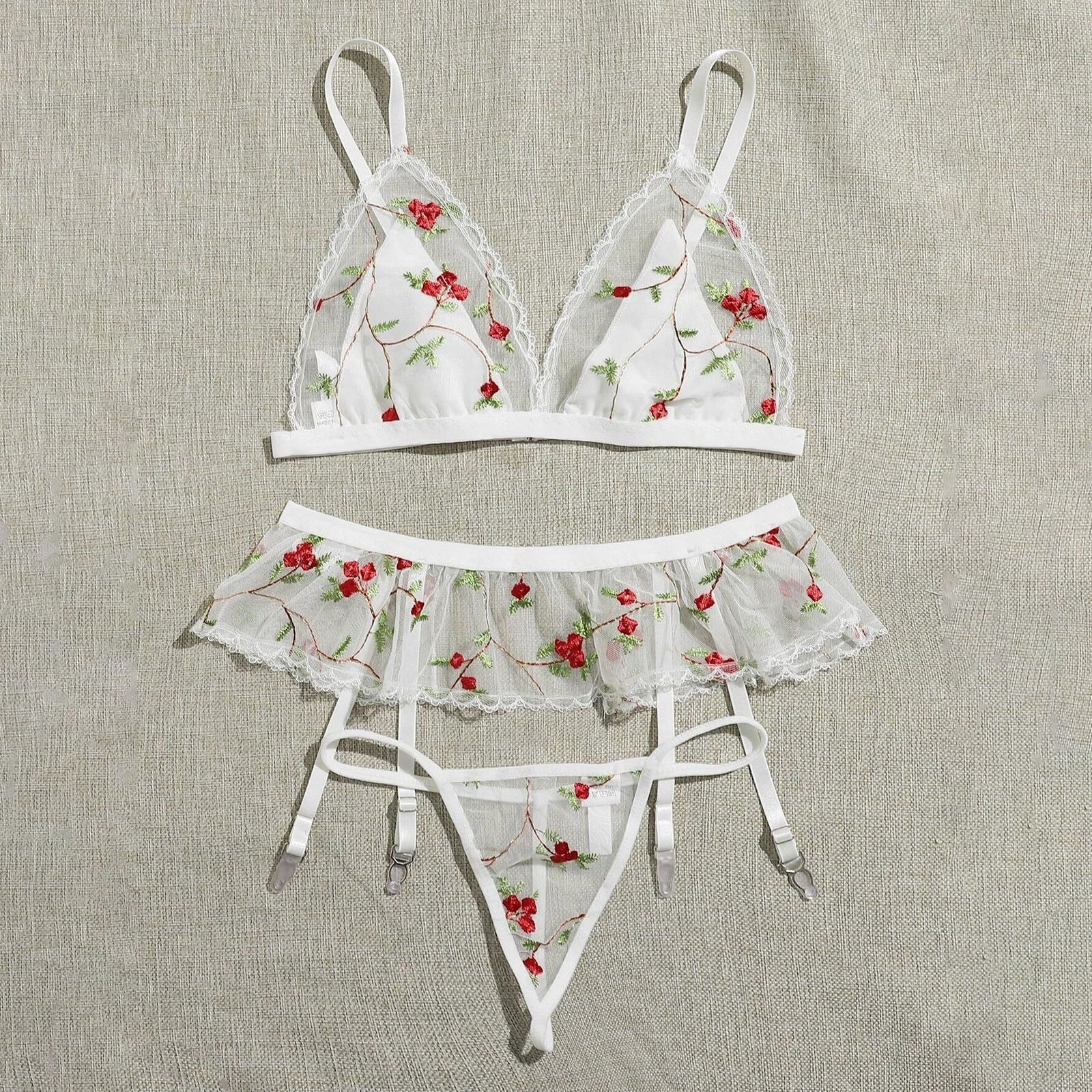 3PCS Lace Embroidery Underwear Women Set Sexy Lingerie Mesh Perspective Lenceria Sensual Mujer Erotic Hot Bra Brief Garter Sets