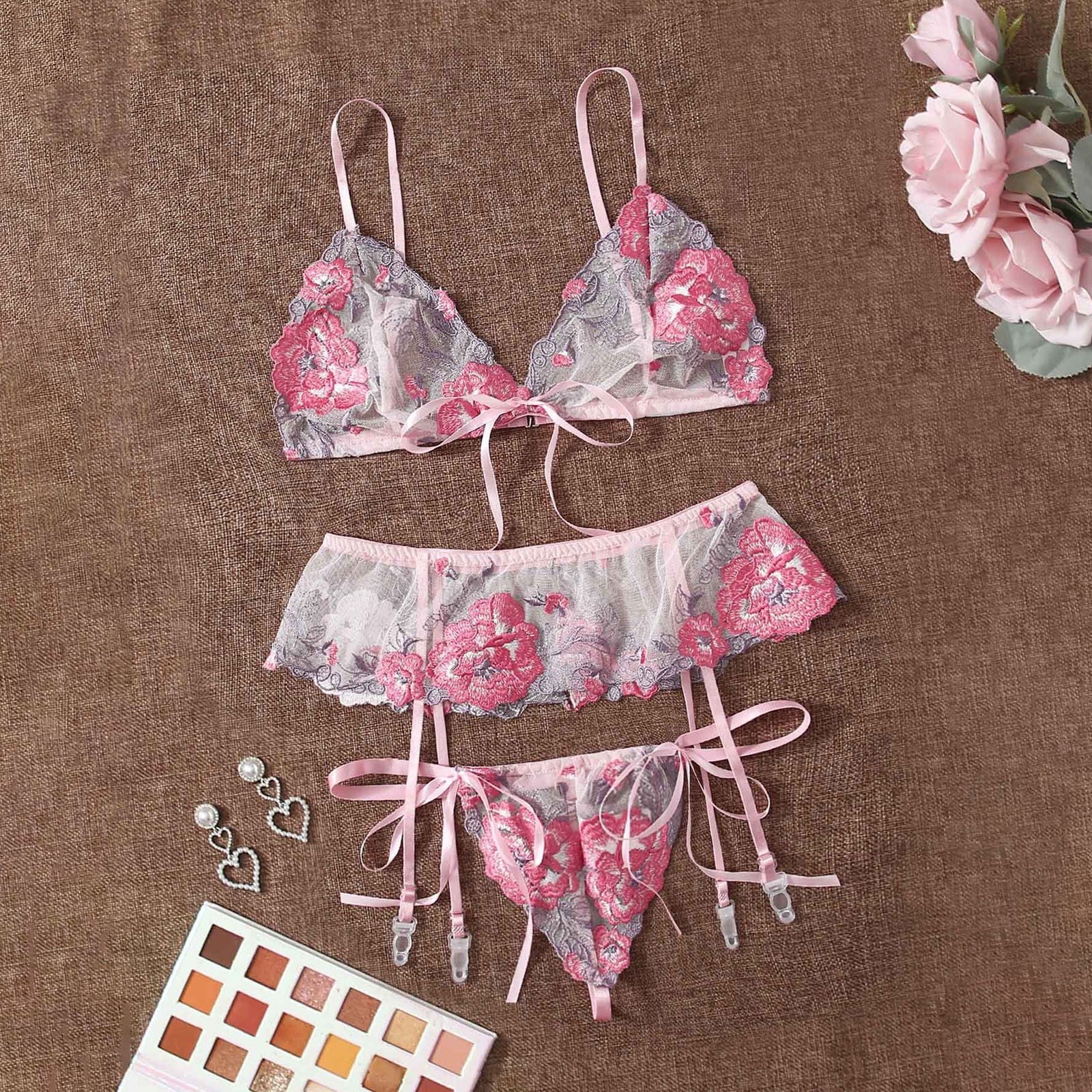 3PCS Sexy Bra Lingerie Sets Women Sexy Fashion Embroidery Bowknot Bra Lingerie Ladies Flower Lace Transparent Panty Garter Sets