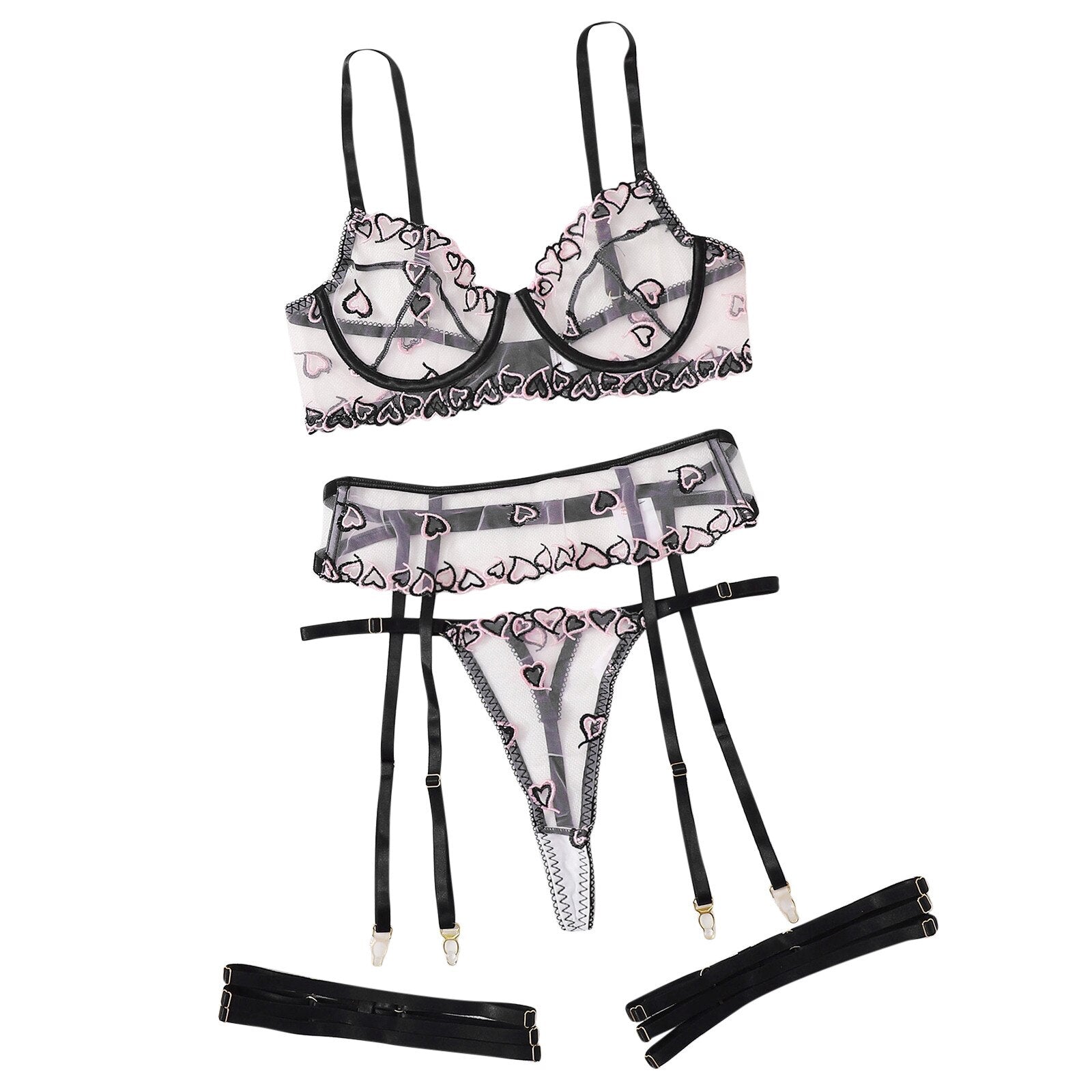 3pcs Sexy Underwear Set Fashion Heart Embroidered Women's Underwear See Through Bra Panty With Garter Lingerie Set Seamless Bras