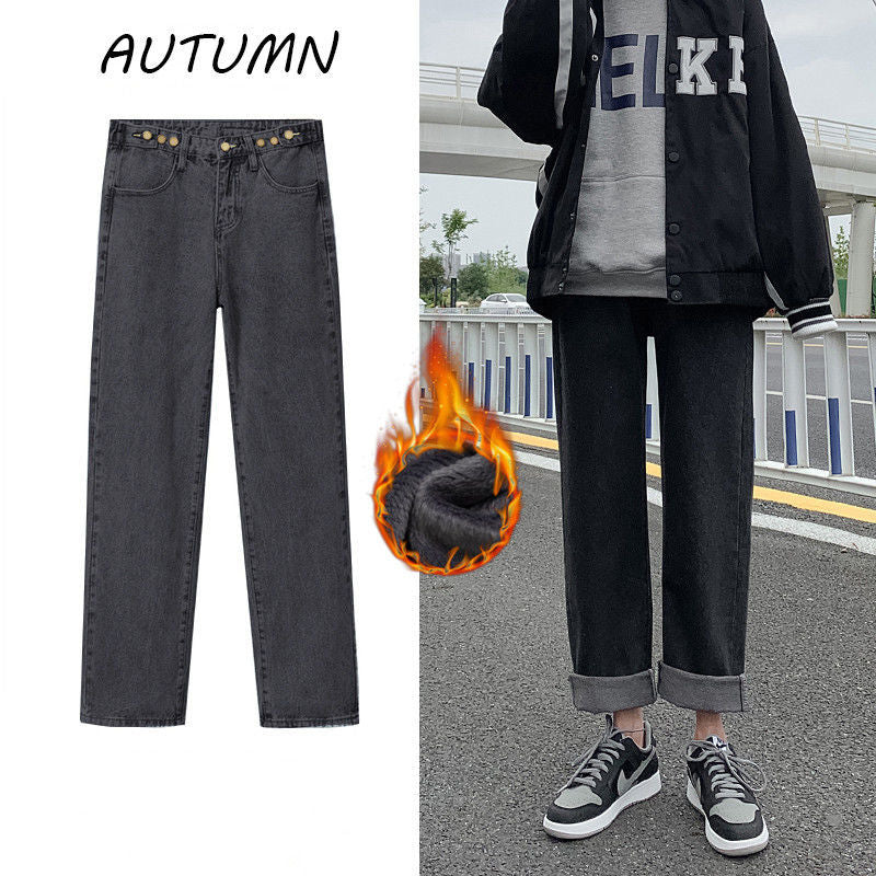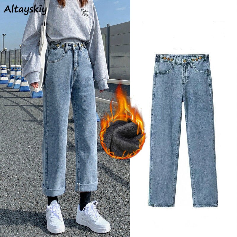 Ankle-length Jeans Women Plus Velvet Thickening All-match Winter Streetwear Solid Female Students Warm Denim Trousers Ulzzang