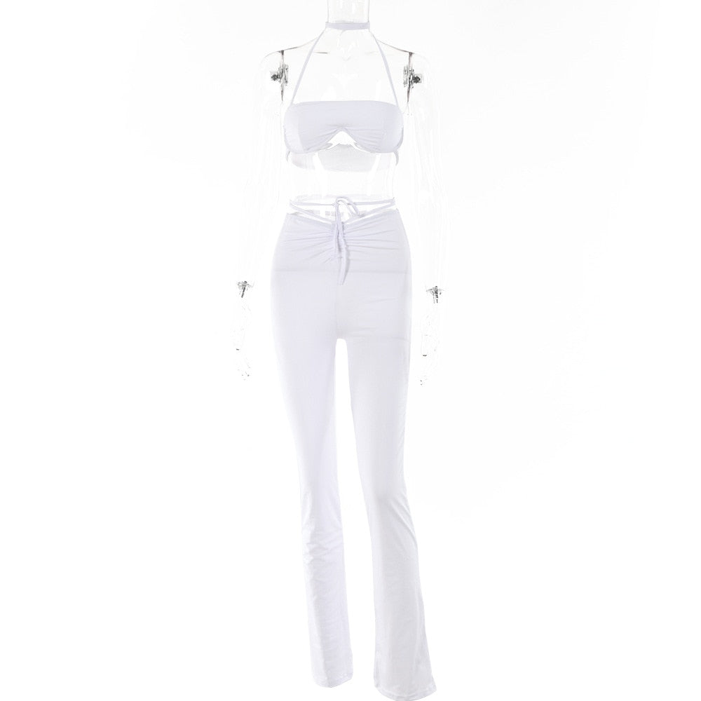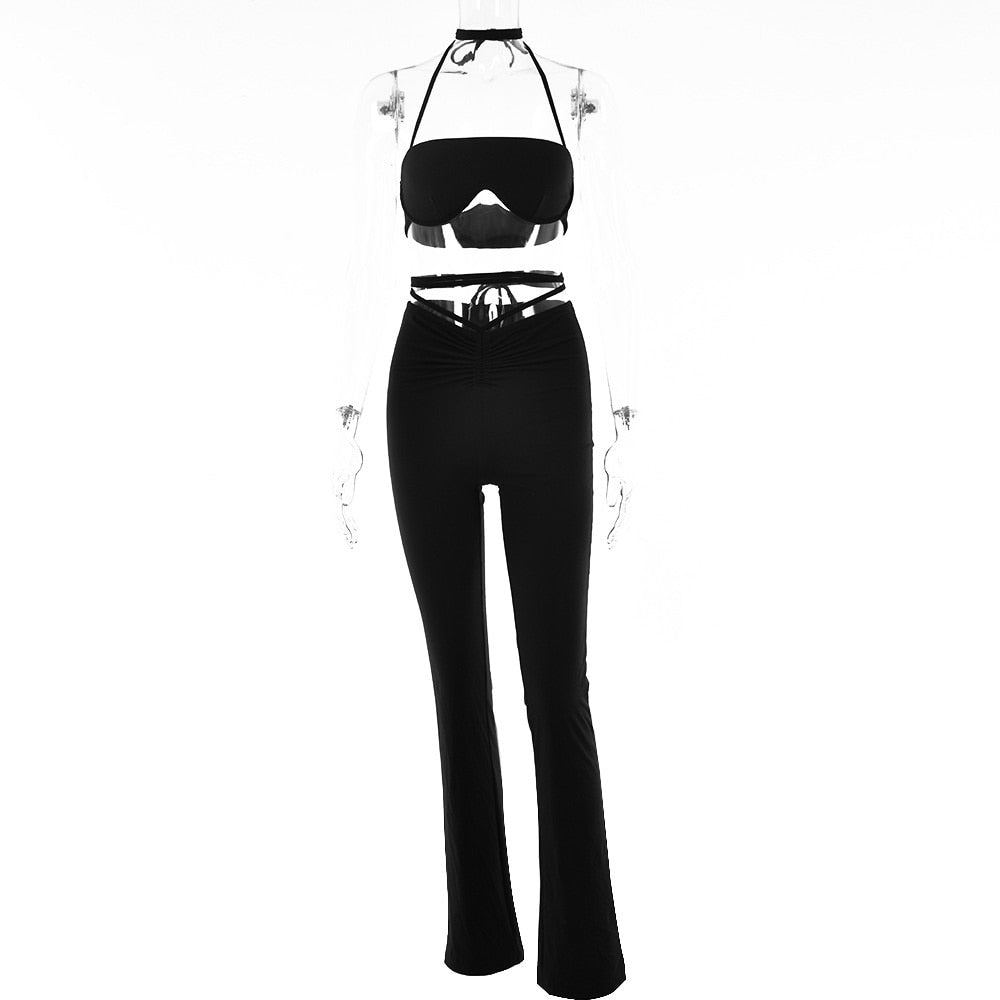 Articat Black Sexy Sleeveless Two Pieces Sets Women Halter Bandage Crop Top Flare Pants Slim Matching Set Backless Club Outfits