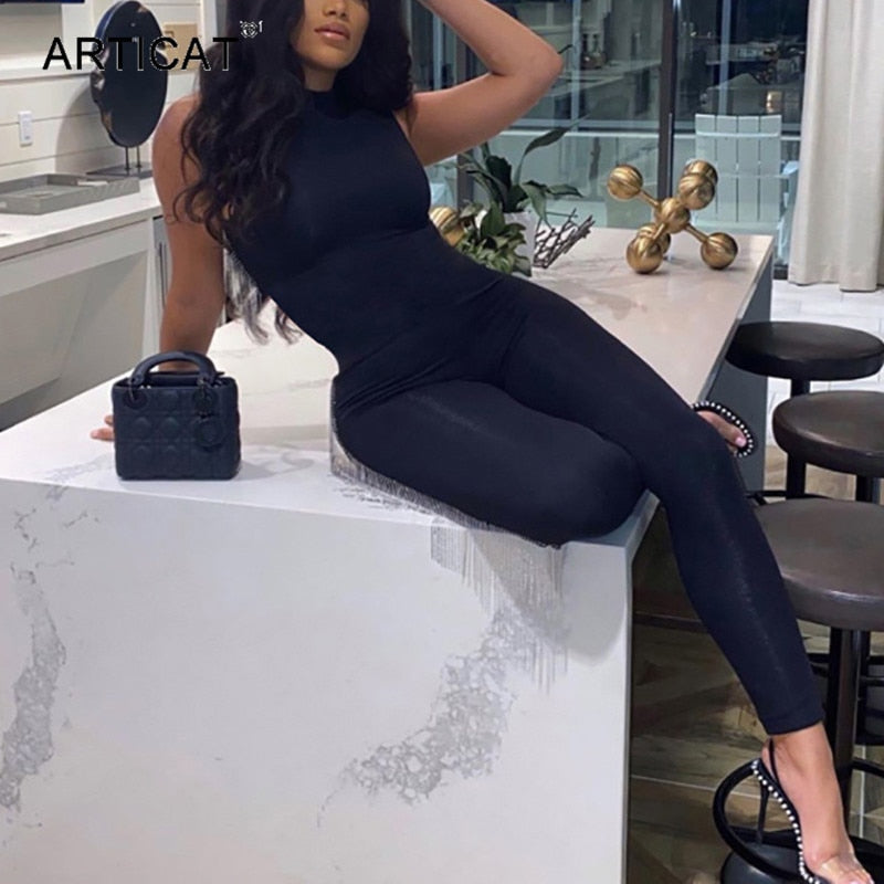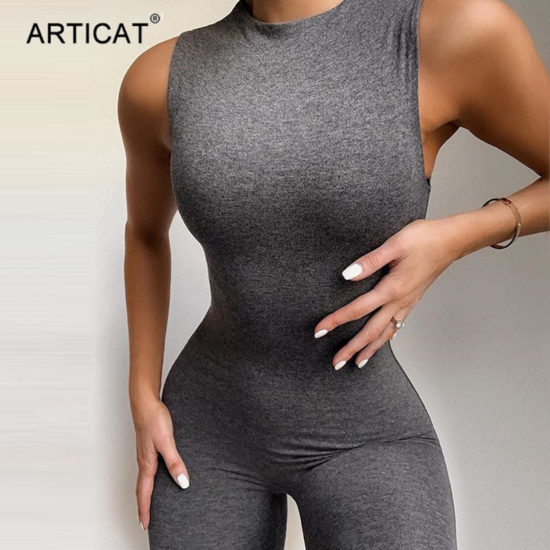 Articat Mock Collar Sleeveless Skinny Jumpsuit Women 2020 Summer Casual Bodycon Rompers Ladies Streetwear Bodysuit Clothes