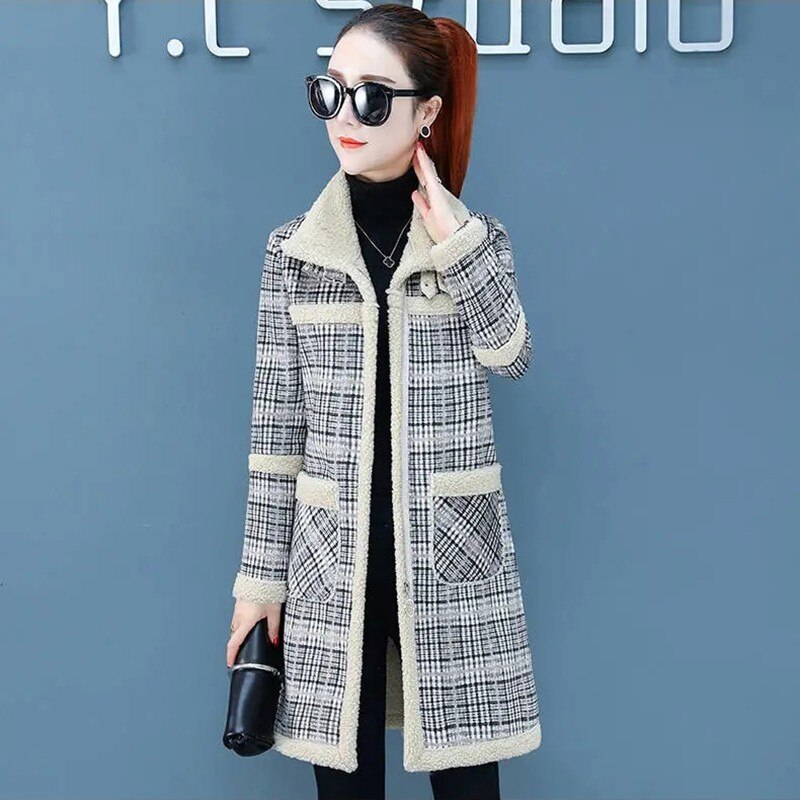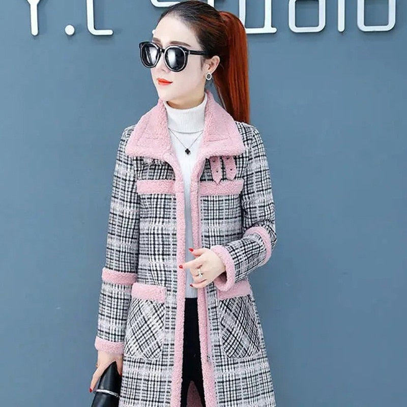 Autumn Elegant Plaid Women Fashion Woolen Coats Ladies Casual Turn-down Collar Coats Female Winter Thick Warm Outwear Plus Size