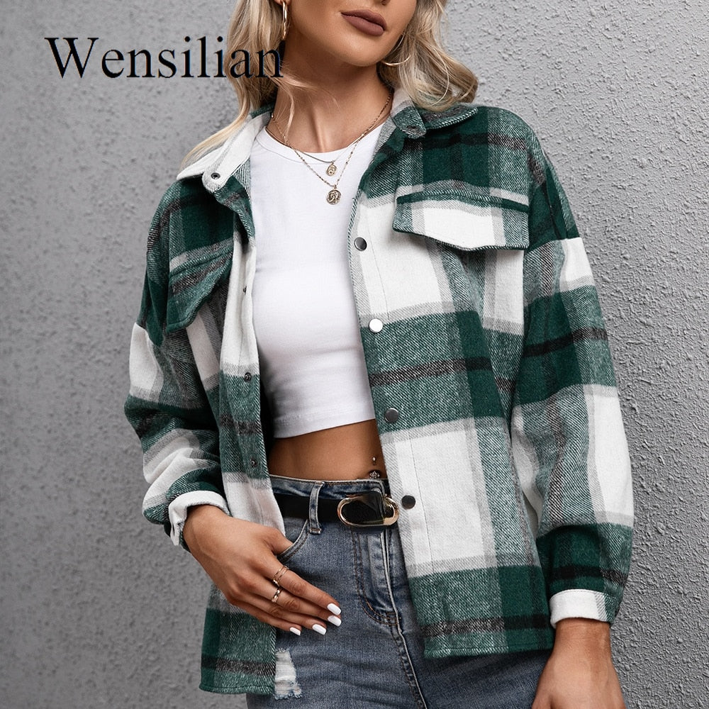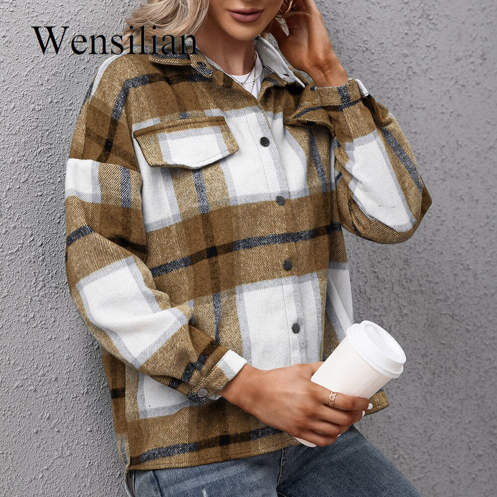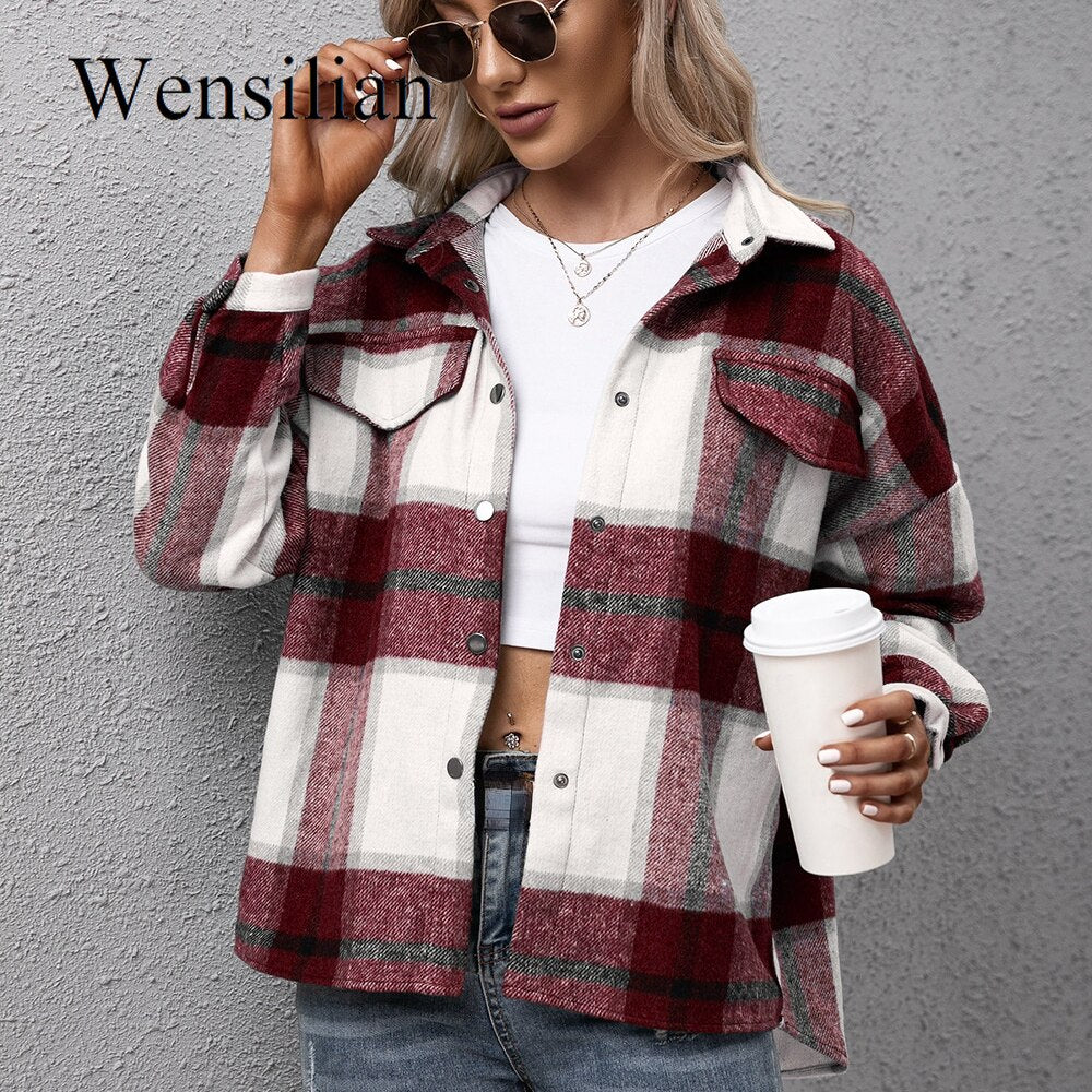Autumn Plaid Shirts Oversize Checkered Jacket Women Loose Style Outerwear Fashion Streetwear Long Sleeves Thick Shirt Jacket
