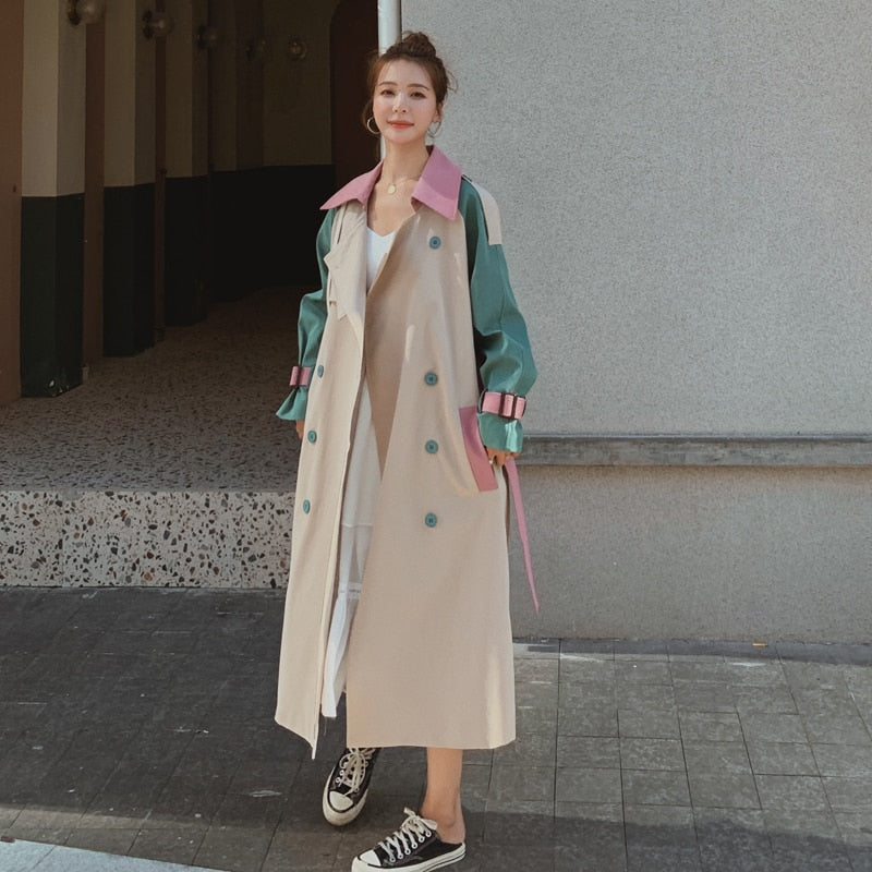 Brand New Fashion Lady Trench Coat Double-Breasted with Belt Patchwork Design Oversize Duster Coat Women Outerwear Spring Autumn