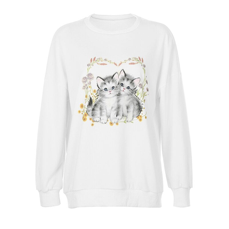 Cat Printed Hoody Women Tops Y2K  Aesthetics Oversize 90S Crew Neck Hoodies Female Retro Pullover Sweatshirts