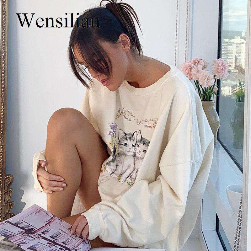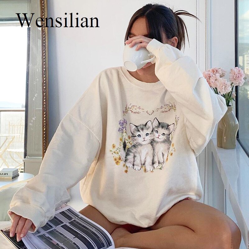 Cat Printed Hoody Women Tops Y2K Aesthetics Oversize 90S Crew Neck Hoodies Female Retro Pullover Sweatshirts