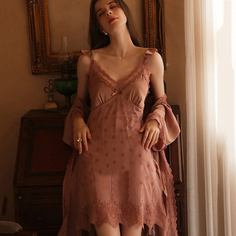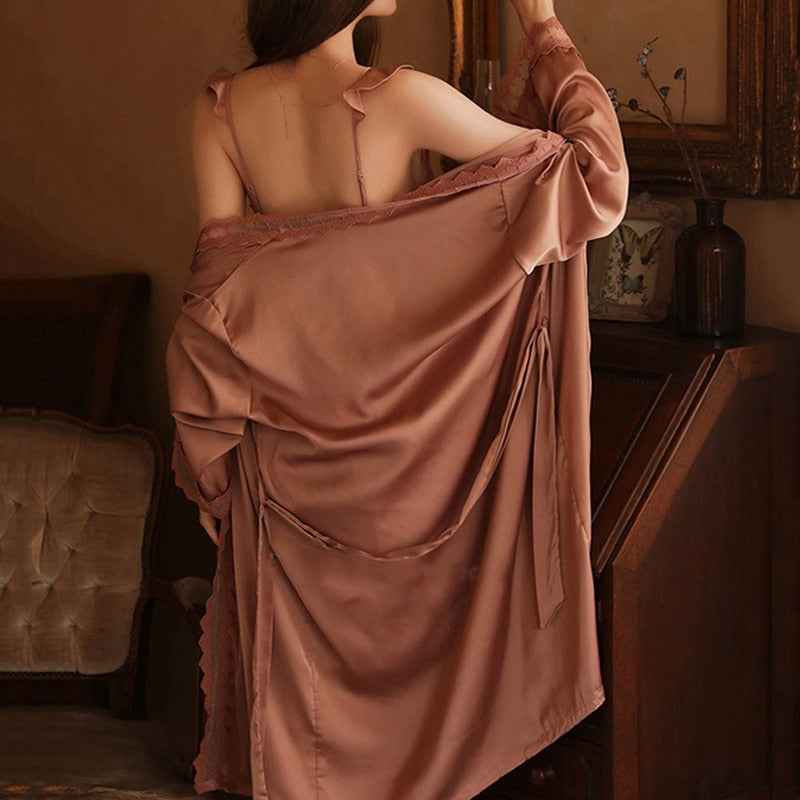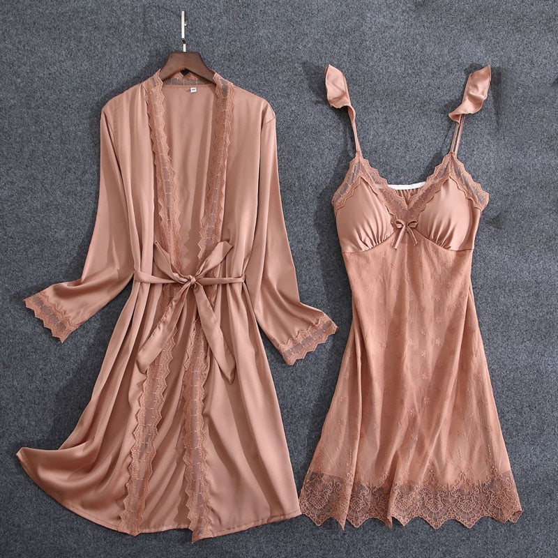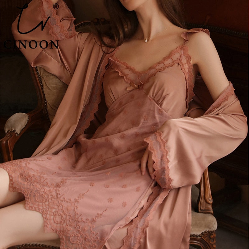 CINOON 2 Pieces Women Pajamas Sets Faux Silk Pajamas Sleepwear Sets Embroidery Lace Bath Gown Wedding Night Dress Robe With Belt