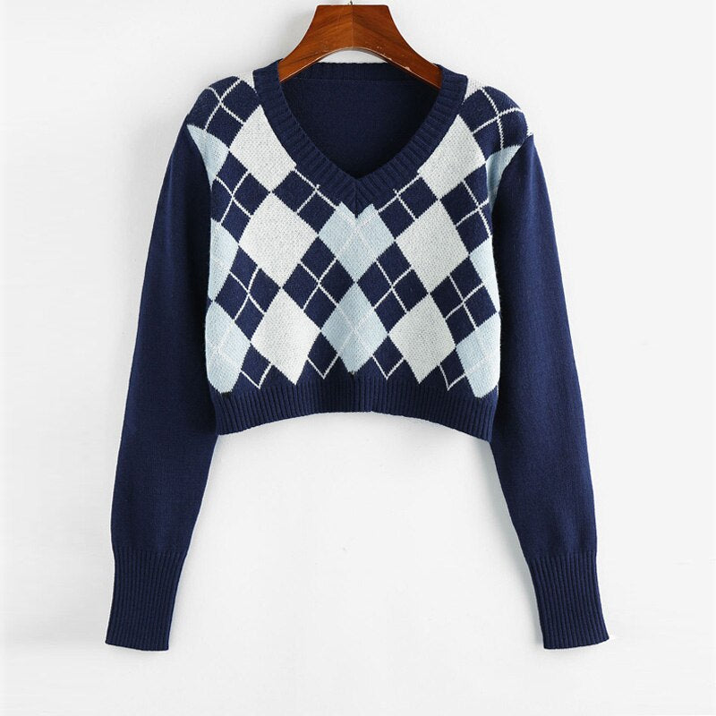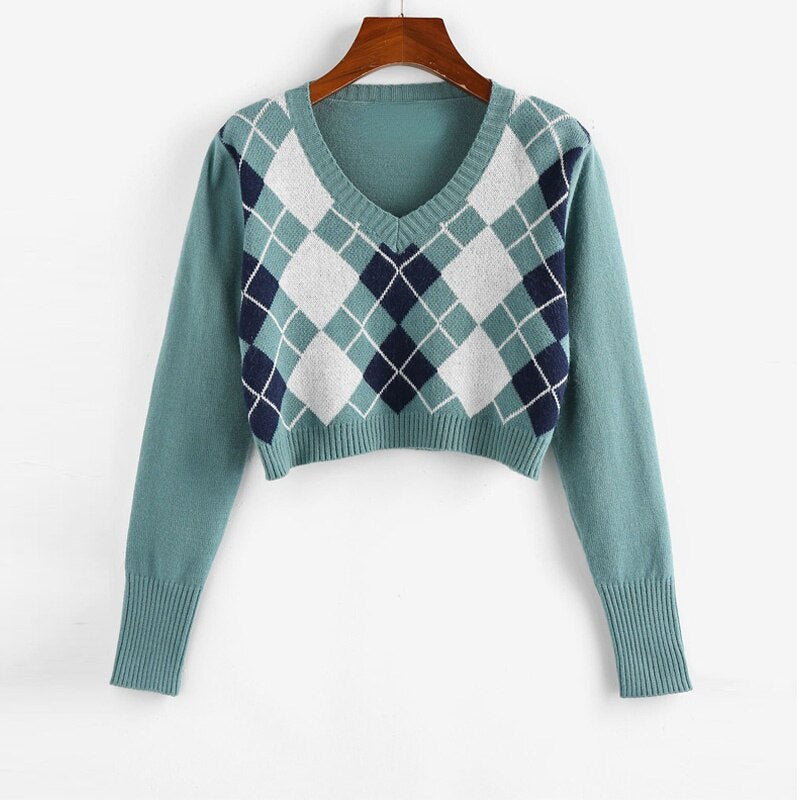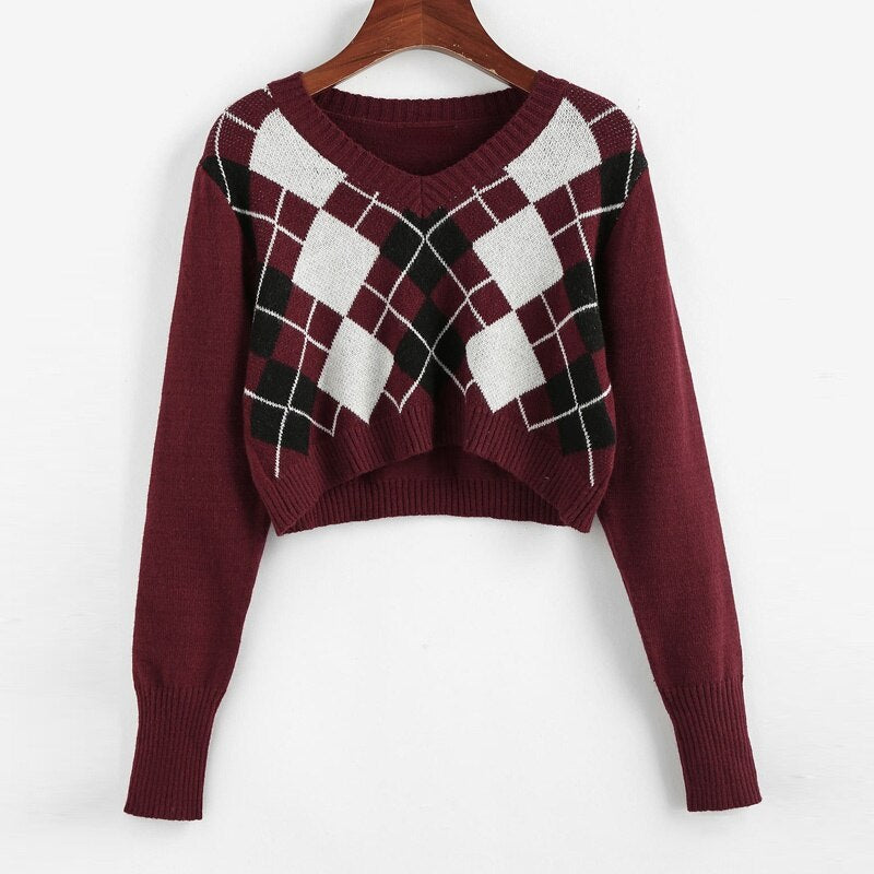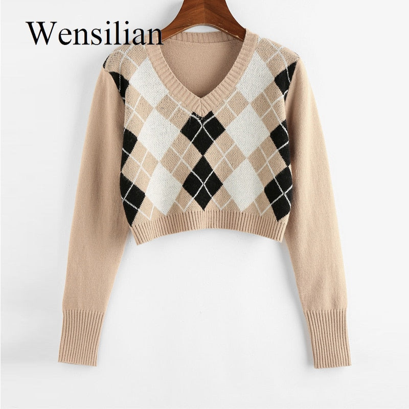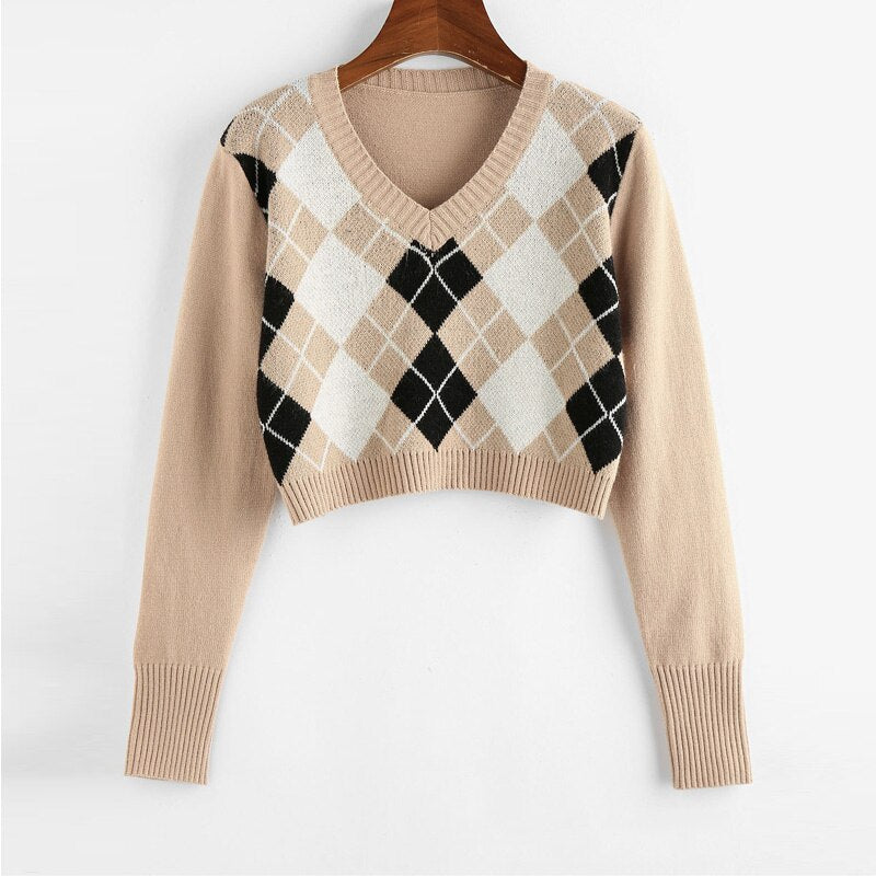 Cropped Argyle Sweater Women V Neck Long Sleeve Pullover Elegant Knit Sweater Top 2021 Fashion Za Style Autumn Jersey Mujer