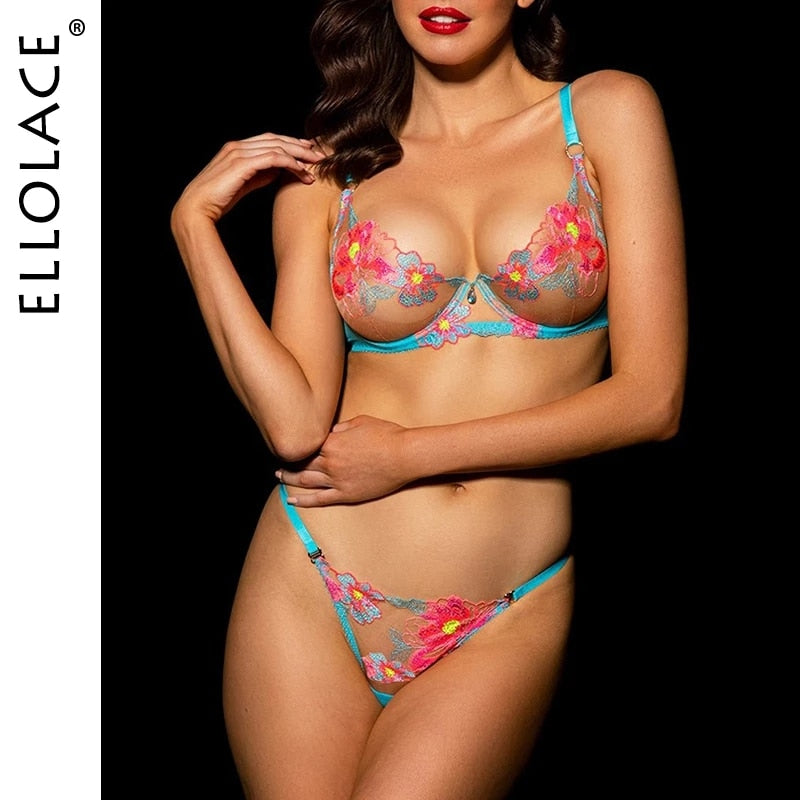 Ellolace Lingerie Set Sexy Exotic Fancy Floral Transparent Underwear Lace Sensual Push Up Underwire Bra Garters Thong Brief Sets