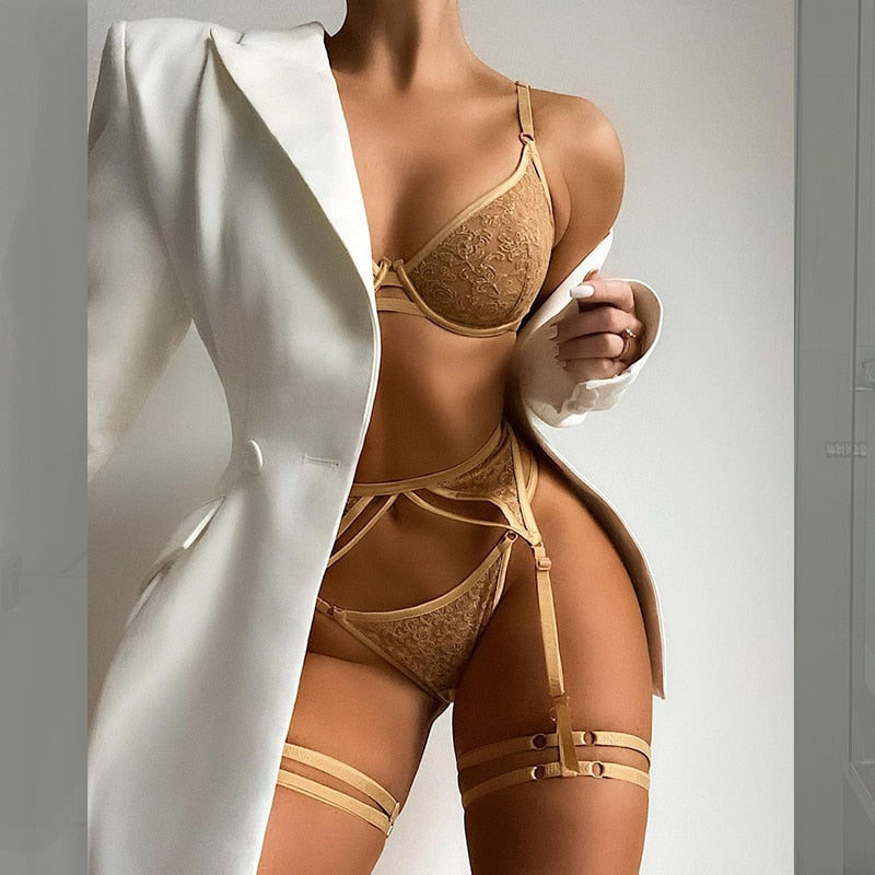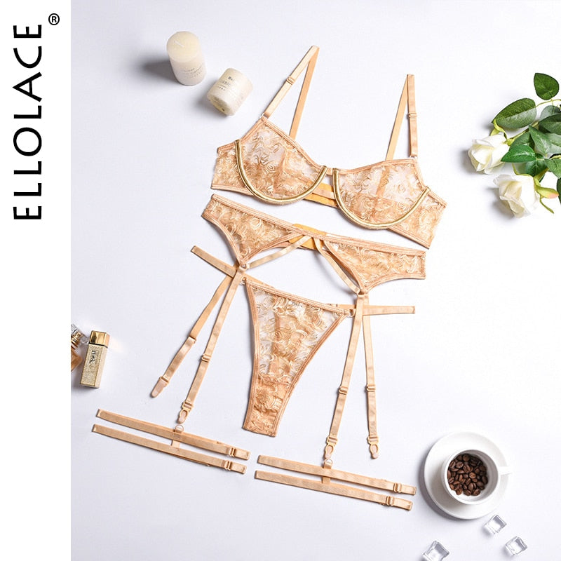 Ellolace Sensual Lingerie Woman Embroidery Lace Sexy Underwire Bra Erotic Underwear Transparent Intimate 4 Piece Sex Setup Sets