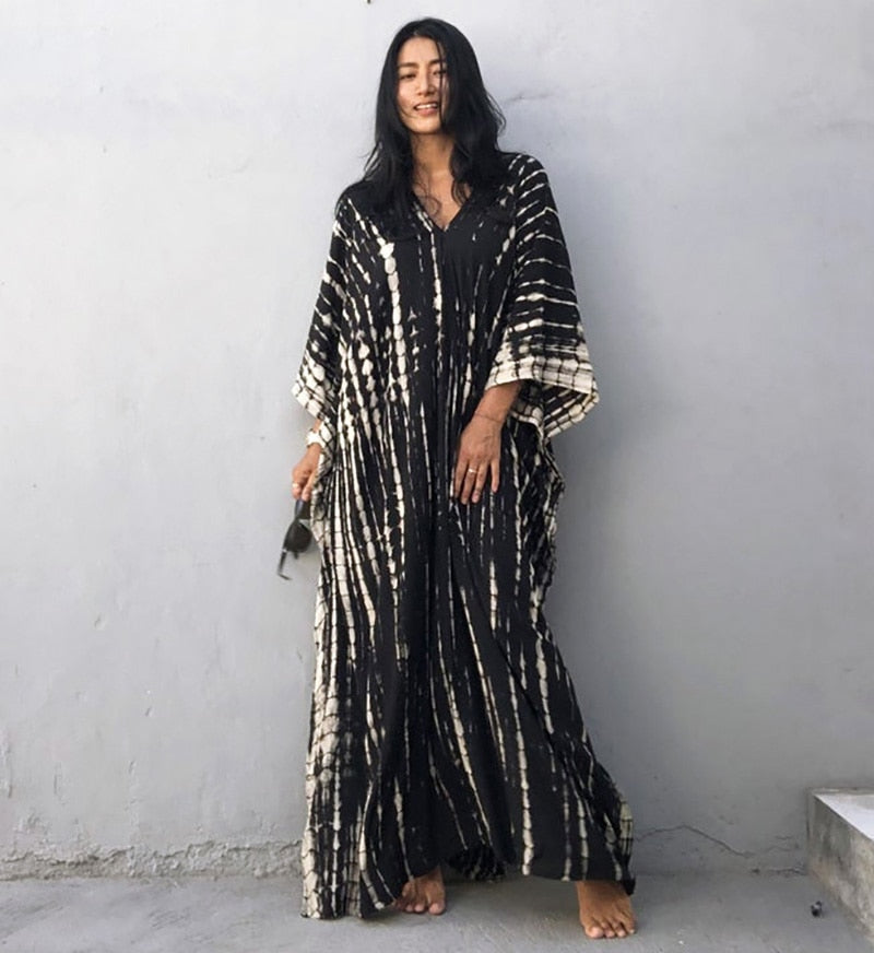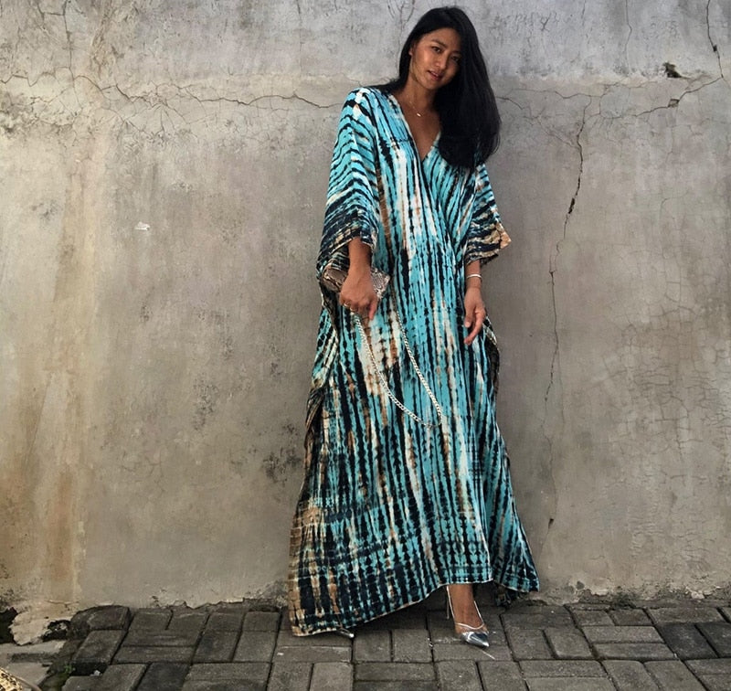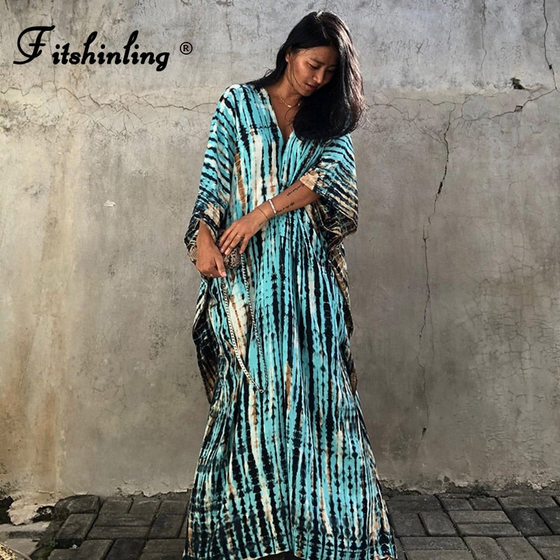 Fitshinling Halo Dyeing Vintage Beach Long Dress Women V Neck Oversize Robe Side Split Loose Kaftan Holiday Boho Maxi Dresses
