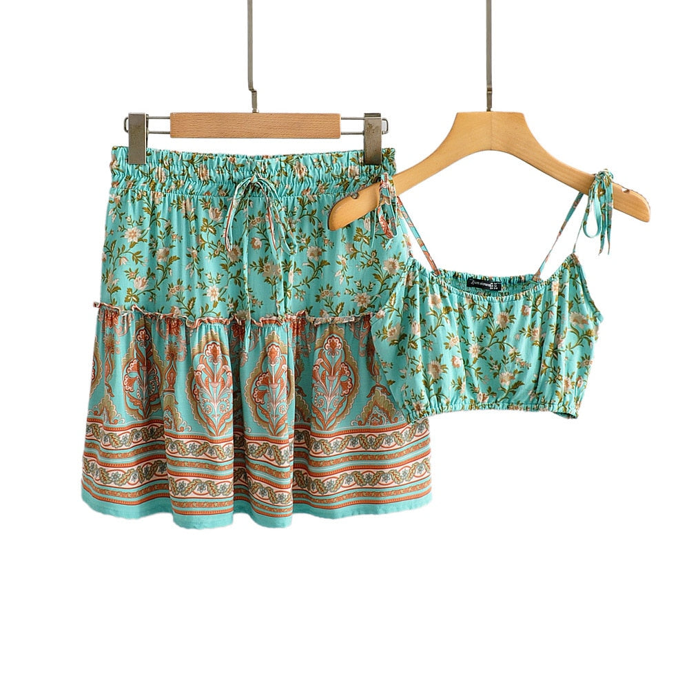 Fitshinling Holiday Summer Women Matching Sets 2021 Print Vintage Camis Skirt Bohemian Outfits Slim Sexy Cotton Two Pieces Suit