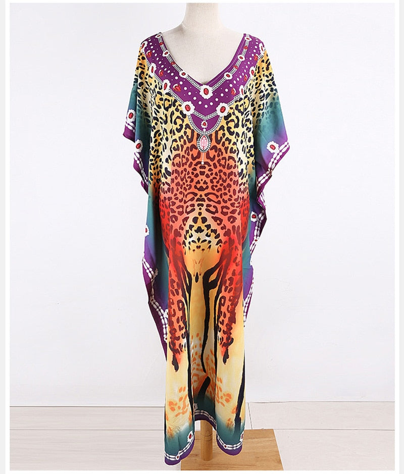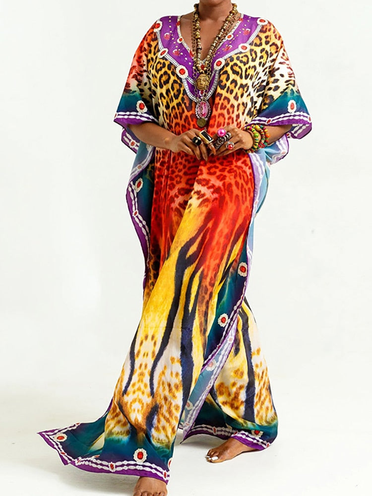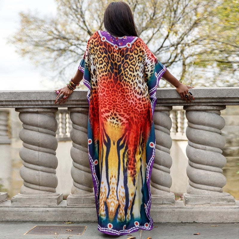 Fitshinling Leopard Print Oversize Beach Long Dress Women Holiday Boho Batwing Sleeve Robe Kaftan Side Split Straight Dresses