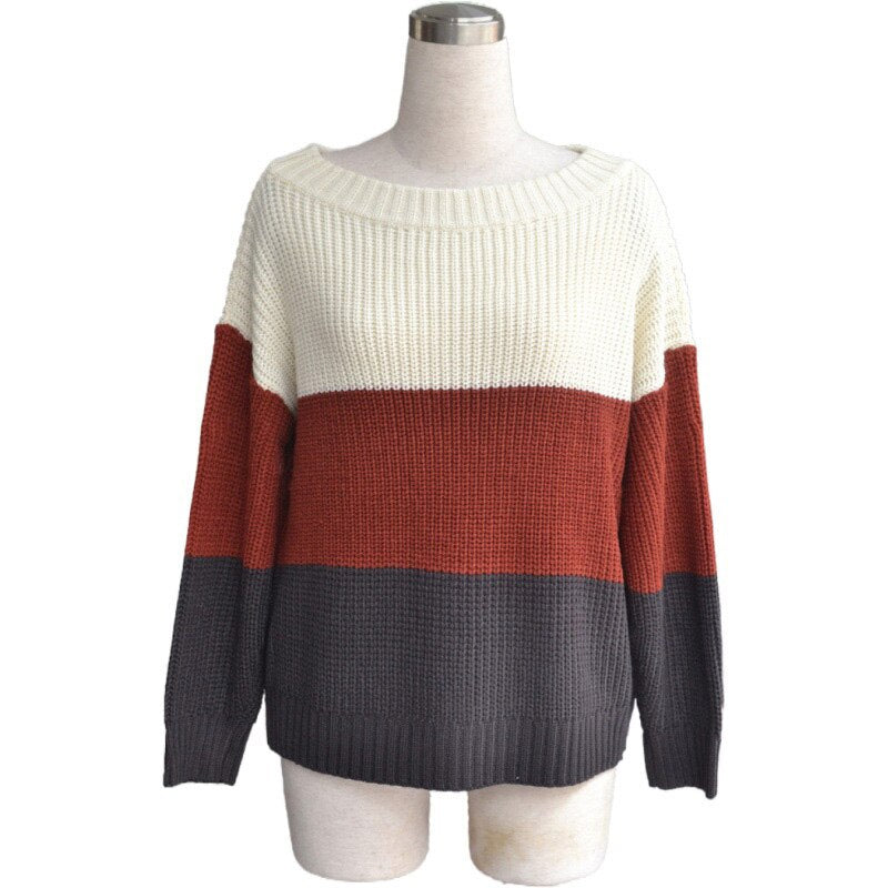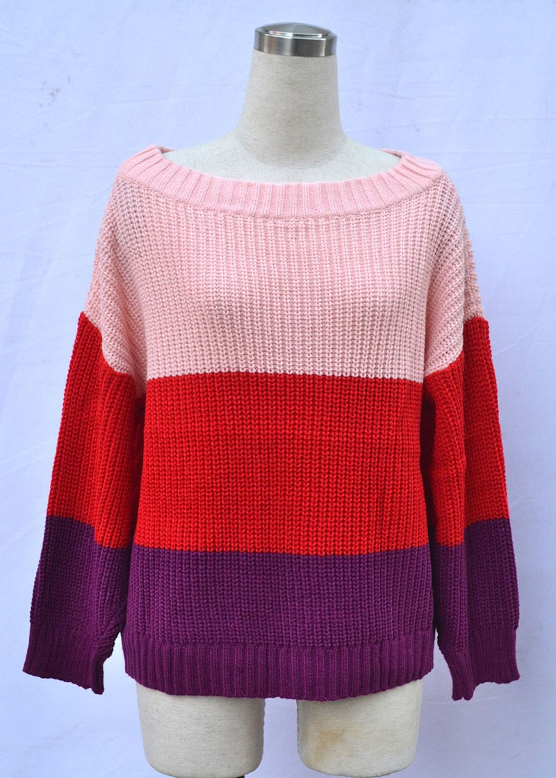 Fitshinling Off Shoulder Women's Oversize Sweater Patchwork Bohemian Pullover Knitted Jumper Holiday Slim Sweaters Women Clothes