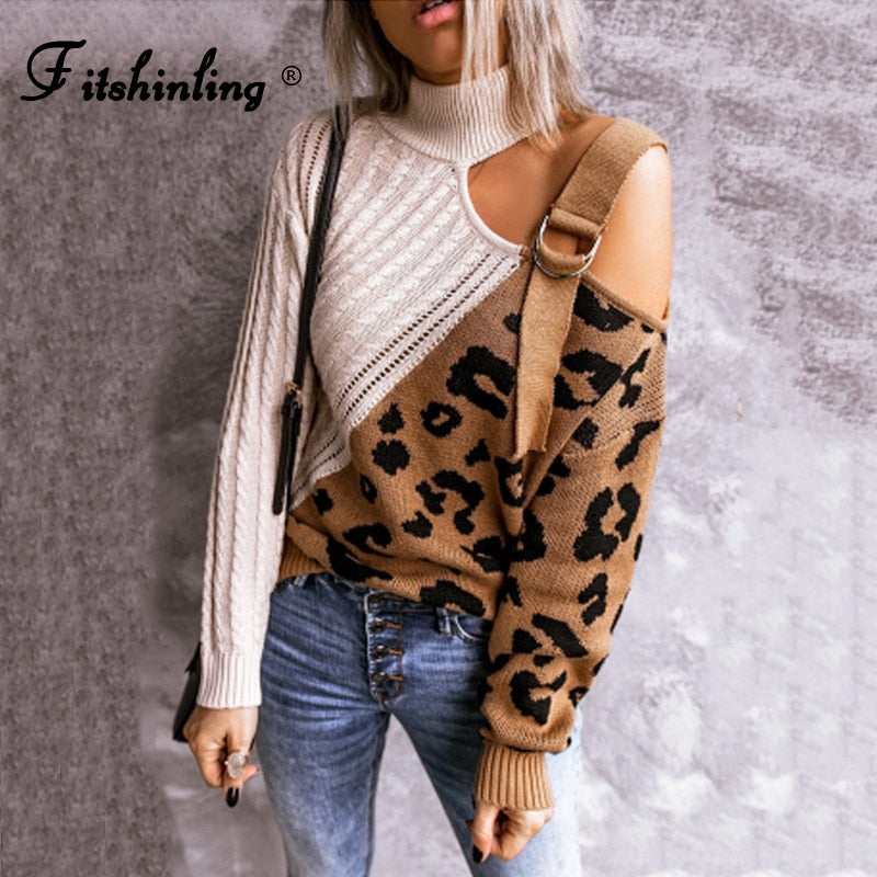 Fitshinling One Shoulder Vintage Sweater Women Clothing Leopard Patchwork Slim Fashion Jumper Autumn New Knitted Pullover Sale