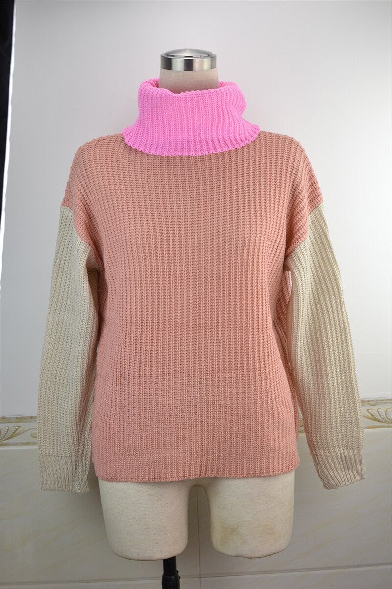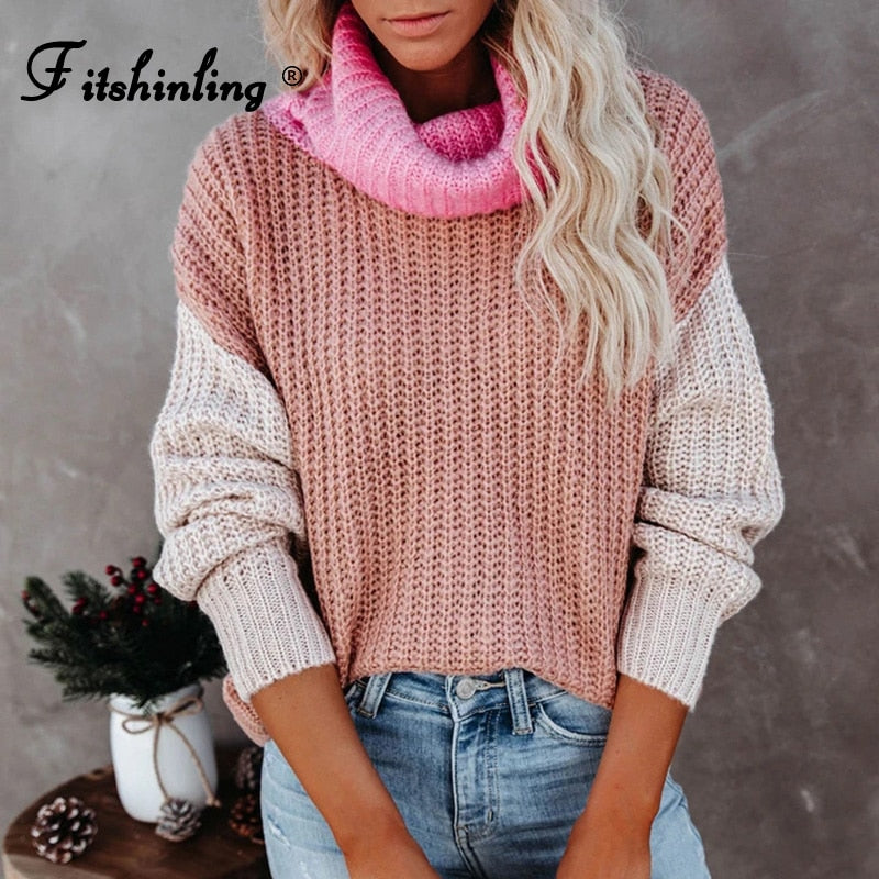 Fitshinling Patchwork Turtleneck Women Knitted Sweater 2021 New Arrival Boho Pullover Fashion Slim Jumper Vintage Winter Tops