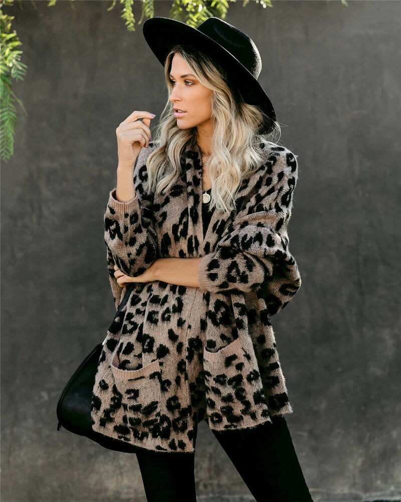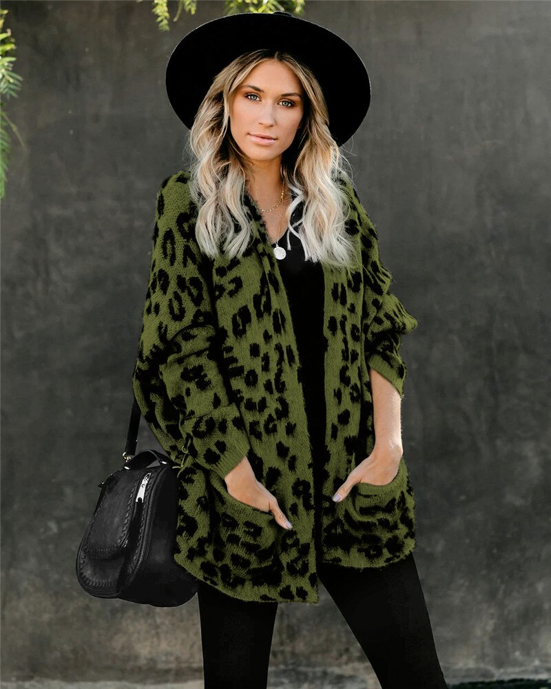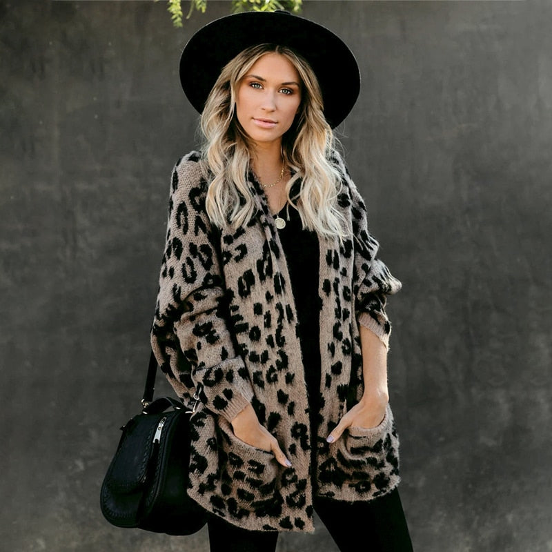 Fitshinling Pockets Leopard Winter Coat Long Cardigan Knitwear Boho Holiday Slim Knitted Cardigans Woman Clothing Sweaters 2020