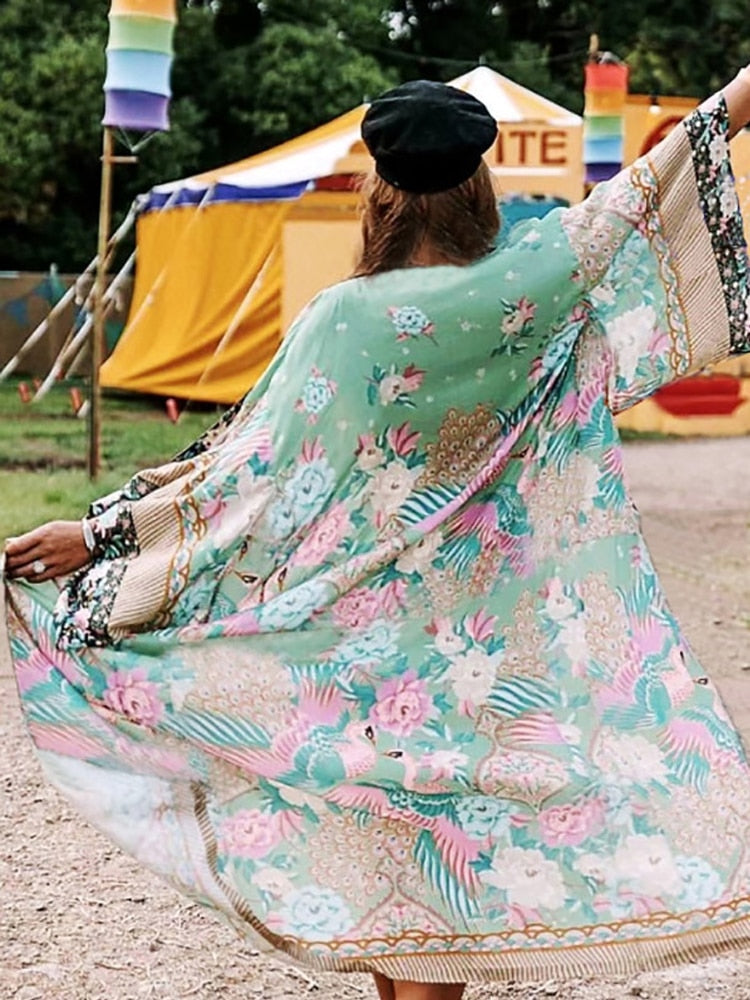Fitshinling Print Chiffon Beach Cover Up Summer Kimono Bikini Outer Cover Swimwear Sexy Long Cardigan Bohemian Holiday Cover-Up