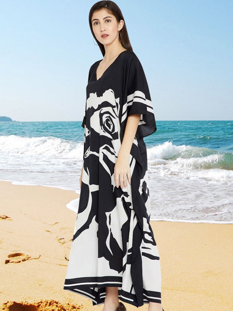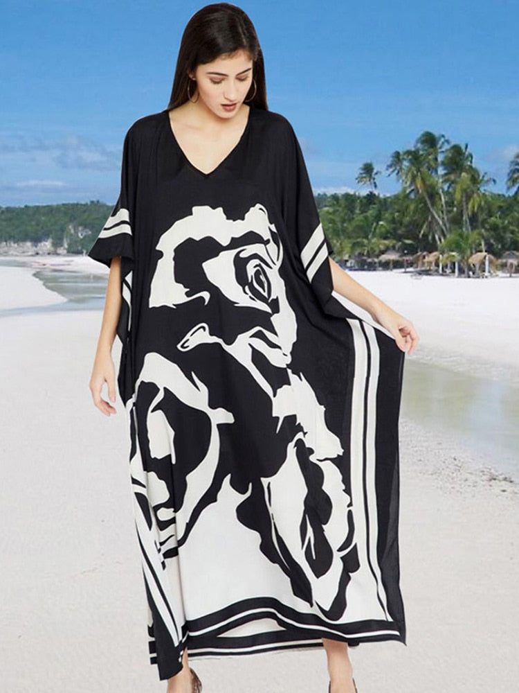 Fitshinling Print Floral Holiday Long Dress Beach Wear Oversized Batwing Sleeve Loose Cover-Up Boho V Neck Pareos Women 2020 New