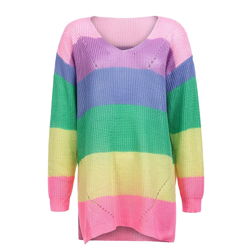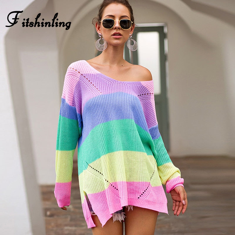 Fitshinling Rainbow Striped Long Sweater Femme Pull V Neck Slim Pullovers Autumn Winter Long Sleeve Sweaters Women Jumpers Sale
