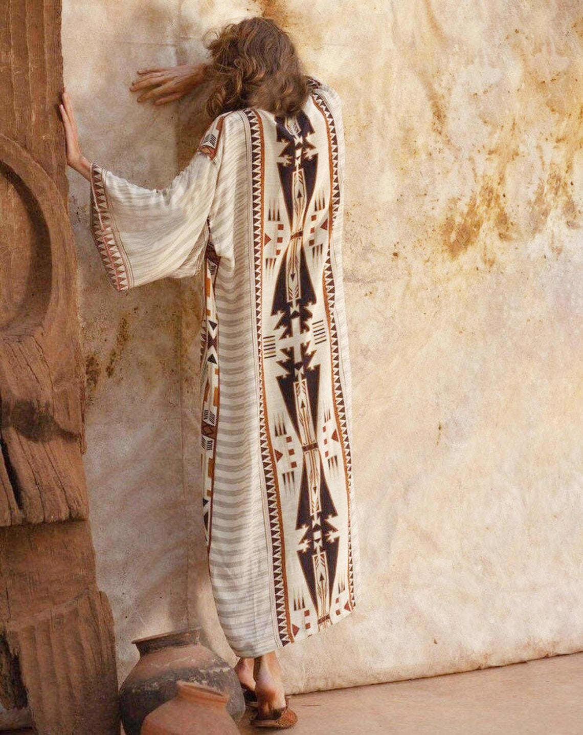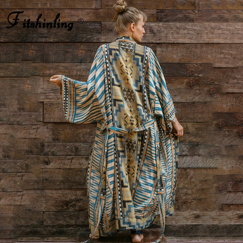 Fitshinling Vintage Geometric Beach Kimono Bohemian Oversized Cardigan With Belt Holiday Slim Ethnic Tribe Swimsuits Cover Up