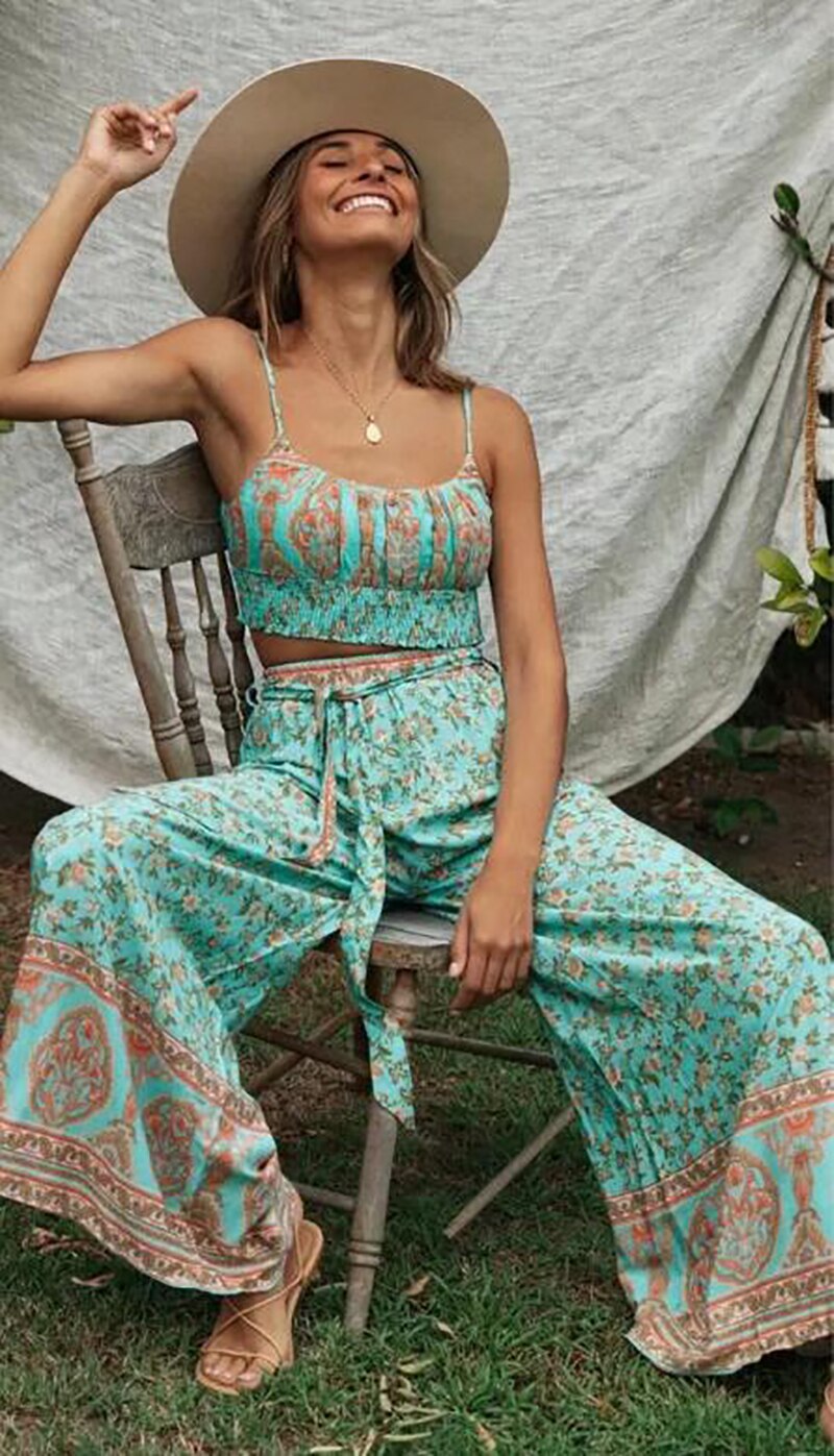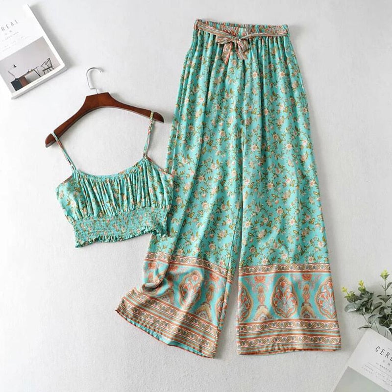 Fitshinling Wide Leg Pants Camis Matching Sets Bohemian Holiday Print Summer Outfits 2021 Two Pieces Slim Sexy Vintage Suits New