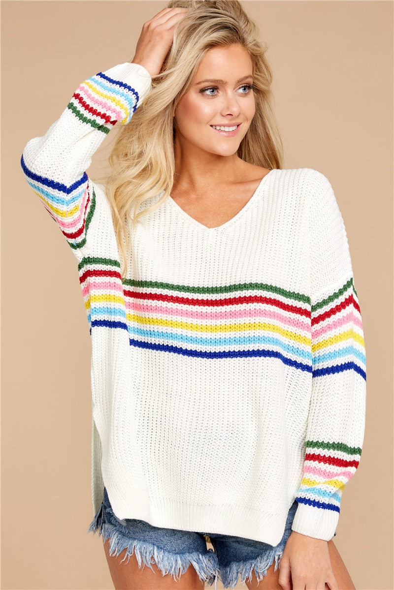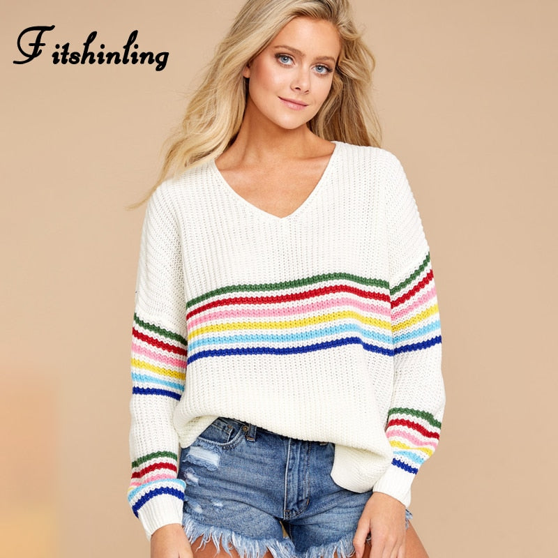 Fitshinling Winter Fashion Women's Sweaters 2020 Rainbow Striped Slim Pullovers Korean Style Knitted Jumper V Neck Pull Femme