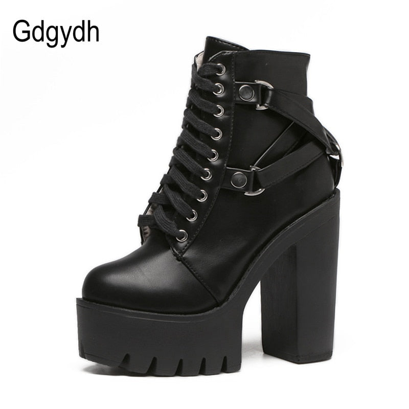 Gdgydh Fashion Black Boots Women Heel Spring Autumn Lace-up Soft Leather Platform Shoes Woman Party Ankle Boots High Heels Punk