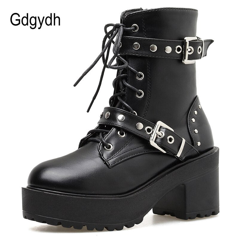Gdgydh Sexy Rivet Autumn Boots Women Platform Boots Black Leather Gothic Punk Style Combat Boots For Women Mid Heels Comfortable