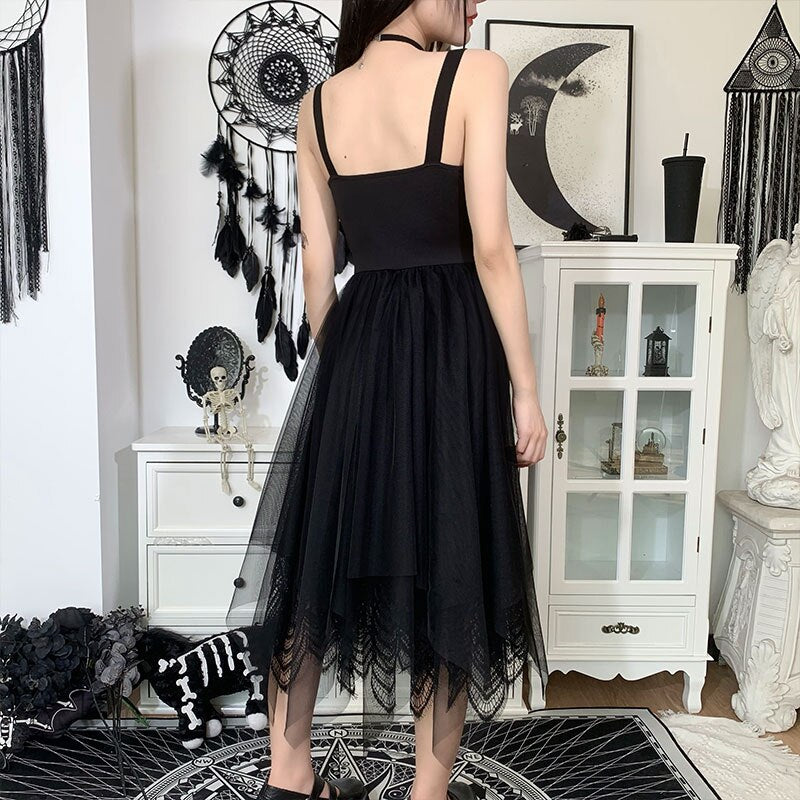 InsGoth Goth Dress Vintage Aesthetic Mesh Black Corset Dress Punk Sexy Hollow Out Backless High Waist Midi Dresses Summer 2021