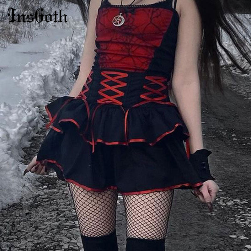 InsGoth Goth Punk Red Bandage Skirt Streetwear Sexy High Waist Mini Skirts Harajuku Black Patchwork A Line Skirts Gothic Clothes