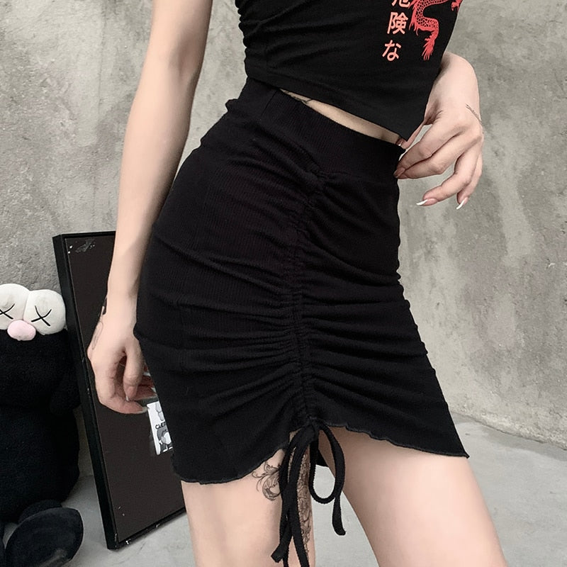 InsGoth Gothic Black MIni Skirt Harajuku Sexy Slit High Waist Skirt Streetwear Punk Skinny Ruched Bandage Skirt Summer Outfits