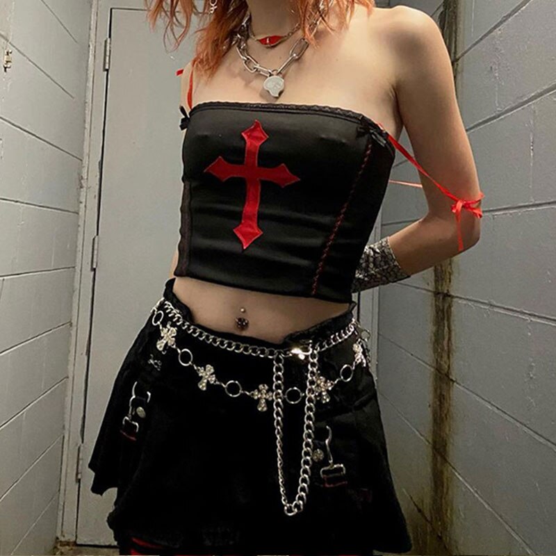 InsGoth Gothic Cross Print Black Camis Grunge Harajuku Lace Up Corset Tops Punk Streetwear Backless Summer Crop Tops Summer 2021