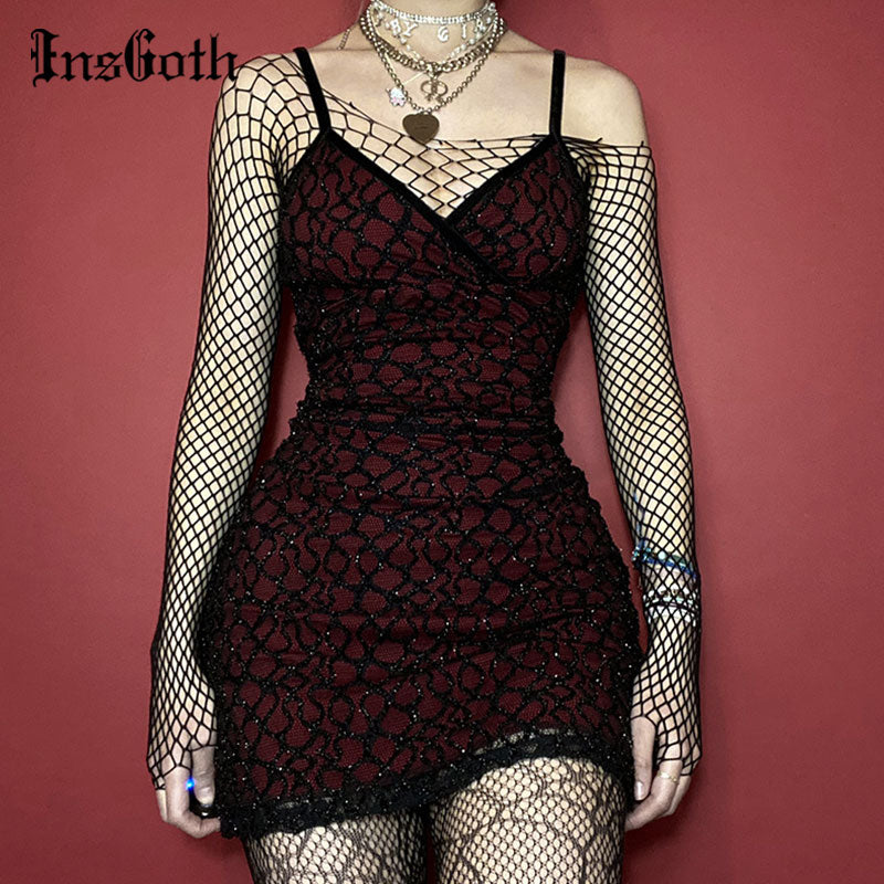 InsGoth Gothic Sexy V Neck Red Dress Grunge Bodycon Backless High Waist Mini Dress Goth Vintage Sleeveless Women Dress Club Wear