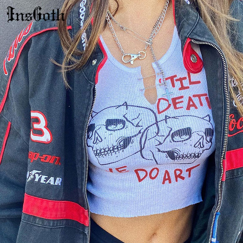 InsGoth Gothic Skull Print White Tanks Harajuku Punk Brook Patchwork Women Tank Top Streetwear Grunge Summer Basic Crop Tops