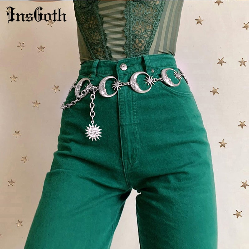 InsGoth Harajuku Punk Moon Metal Belts Women Vintage High Waist Chain Waist Belts Gothic Moon Sun Sliver Pendant Belts Female