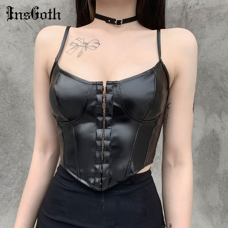 InsGoth PU Leather Y2K Camis Gothic Sexy Spaghetti Straps Black Camisole Punk Streetwear Bodycon Backless Women Cropped Tops