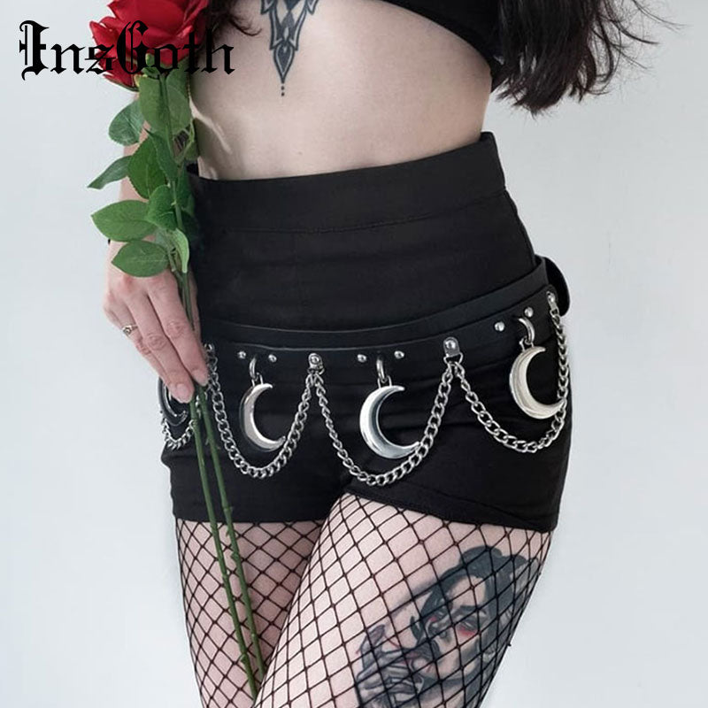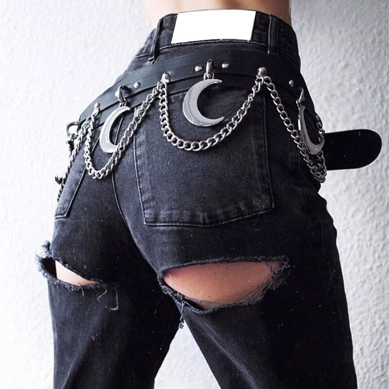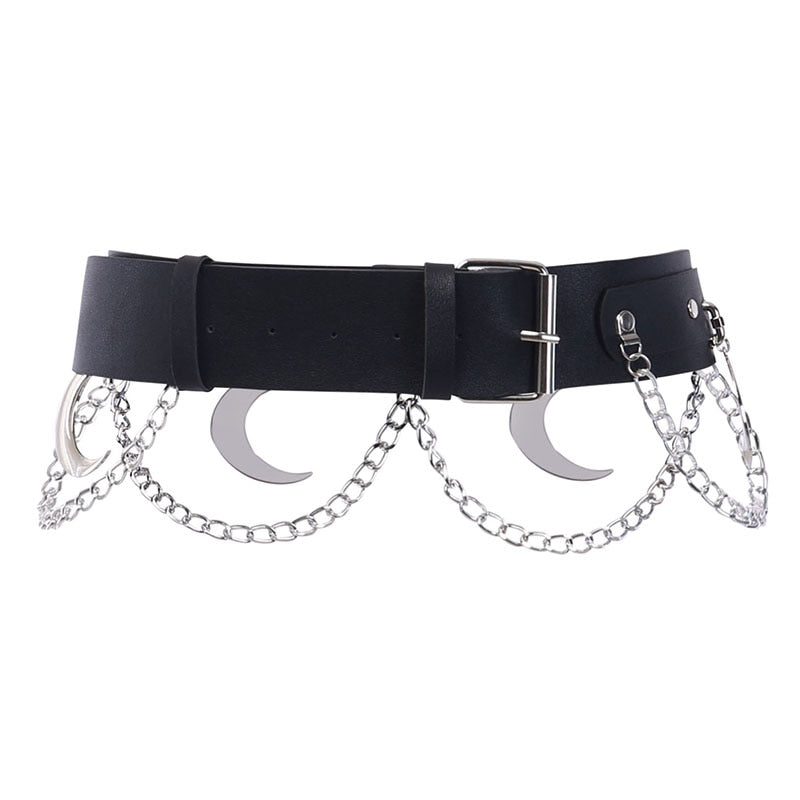 InsGoth Punk Hip Hop Metal Belt PU Leather Belt Gothic Streetwear Chain Moon Goth Belt Dance Streetwear Individual Women Belt